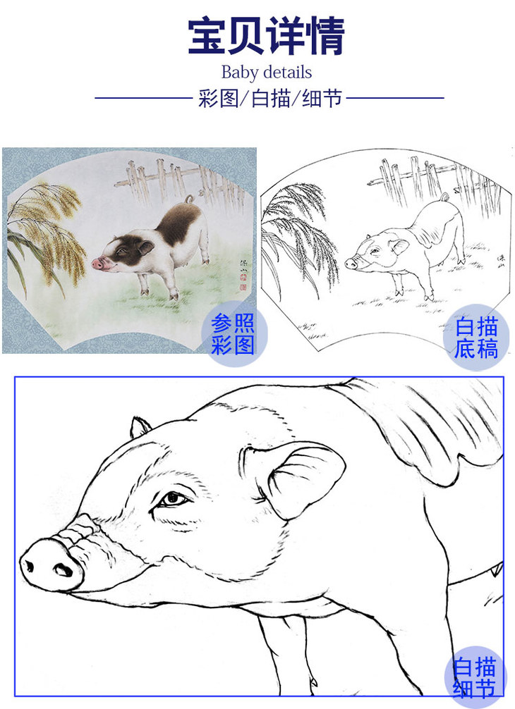 工笔动物白描底稿-李保山-猪《话丰年》-斗方小品册页-多种白描尺寸可选-EL15