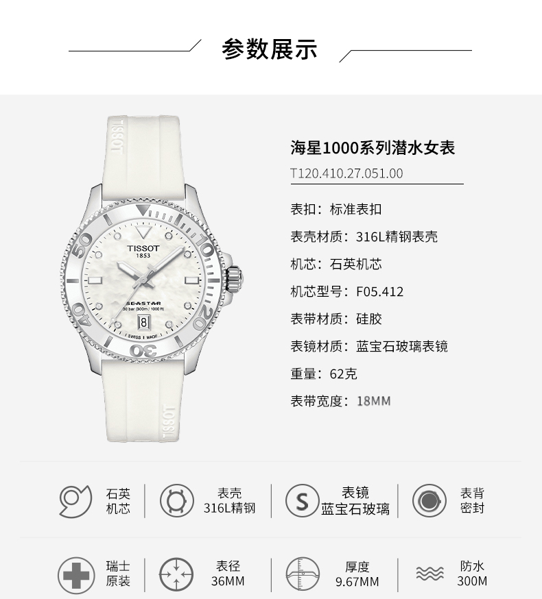 【时计廊】天梭海星1000系列俊雅白硅胶带石英表龚俊同款T120.210.17.116.00