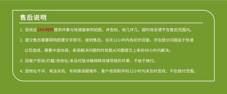 品名:冰糖水果玉米 规格1:4斤家庭装(单果220g+;约5~8根) 规格2:4斤彩箱装(单果220g+;约5~8根)数量仅供参考,以实际重量为准;拍几份发几个包裹,不一定能同时到达,请耐心等待 发货地/产地:漳州 包装方式:泡沫箱+彩袋+食品专用保温冰袋 保质期:收到冷藏保存7天 物流信息:默认丰网/顺丰发货,不支持指定快递 发货区域:新疆、西藏、青海、宁夏、甘肃、内蒙、辽宁、黑龙江、吉林不发;; 物流详情:周六、周日及节假日除外,正常48小时内发货,到货时间约为2~5天,请耐心等待 售后说明:收到货后有质量问题,在24小时内都可以拍照(坏果+快递单面箱子一起拍)上传,申请按坏果比例理赔或联系客服,生鲜性质特殊,因地址错误,手机号联系不上,未及时签收,拒收等造成的损失无法售后,请理解;水果自然生长,大小不作为售后标准~ |