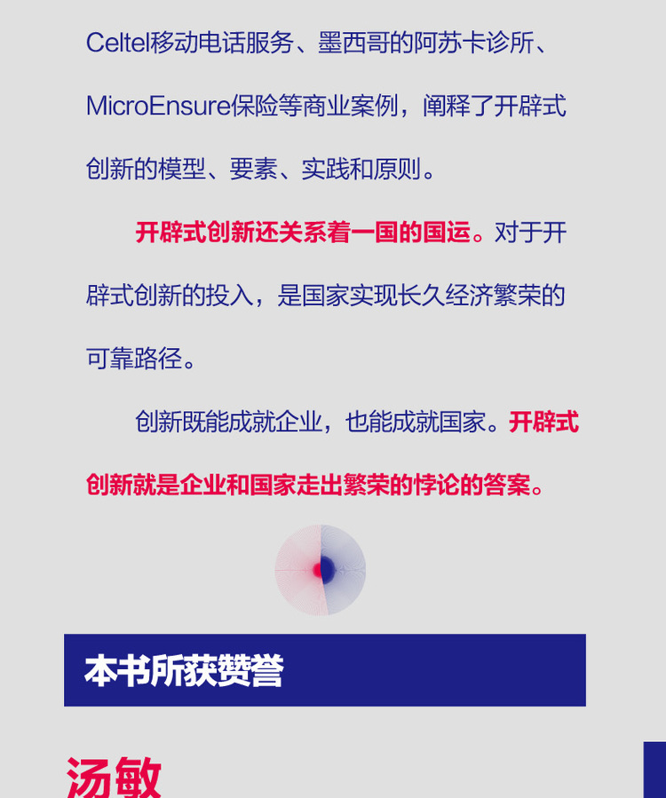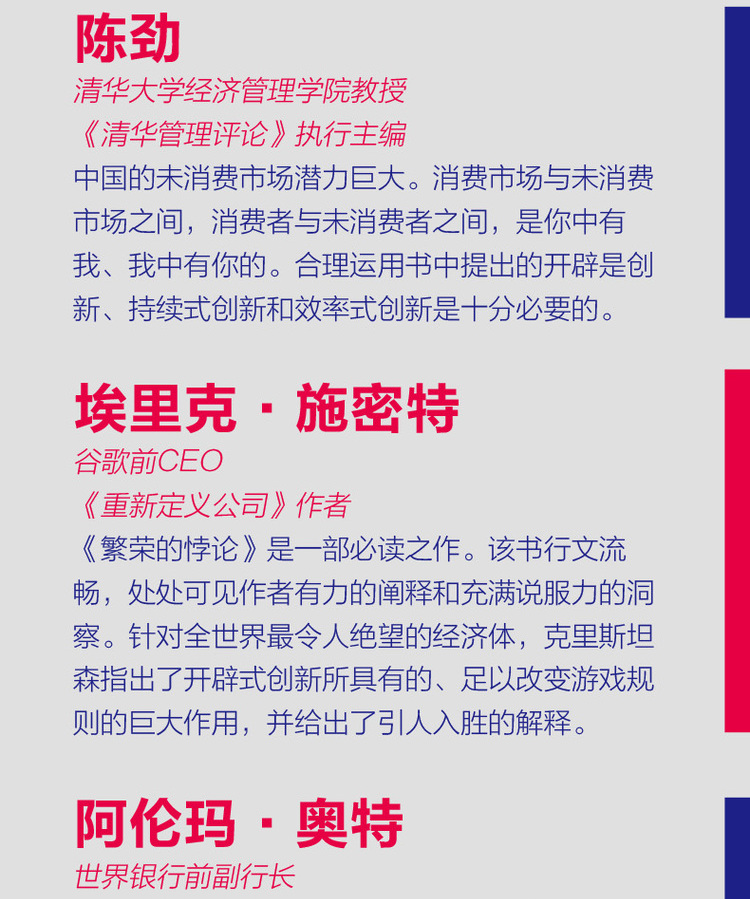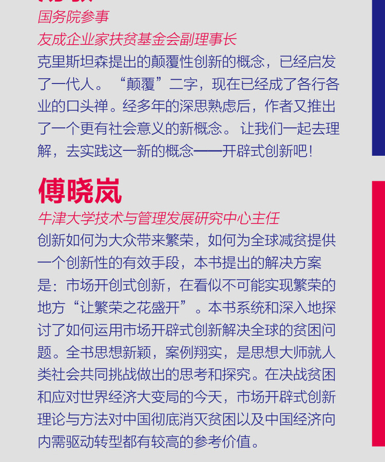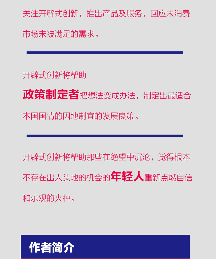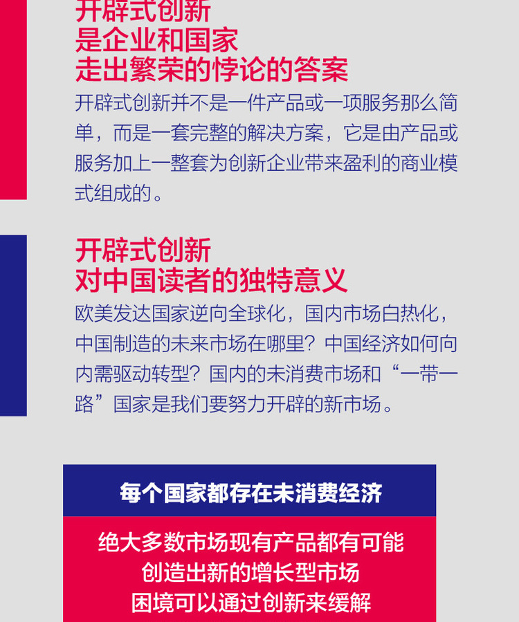 开辟式创新能够启动一个国家的经济引擎,能够帮助创新者和企业家发现未消费市场,为一国增加本地就业和全球就业,继而实现国家繁荣和全球繁荣。创新者和企业家苦苦寻求商机,寻求增长,寻求市场,这本书将转变他们的思维模式,让他们把眼光转向庞大的未消费市场。