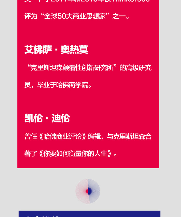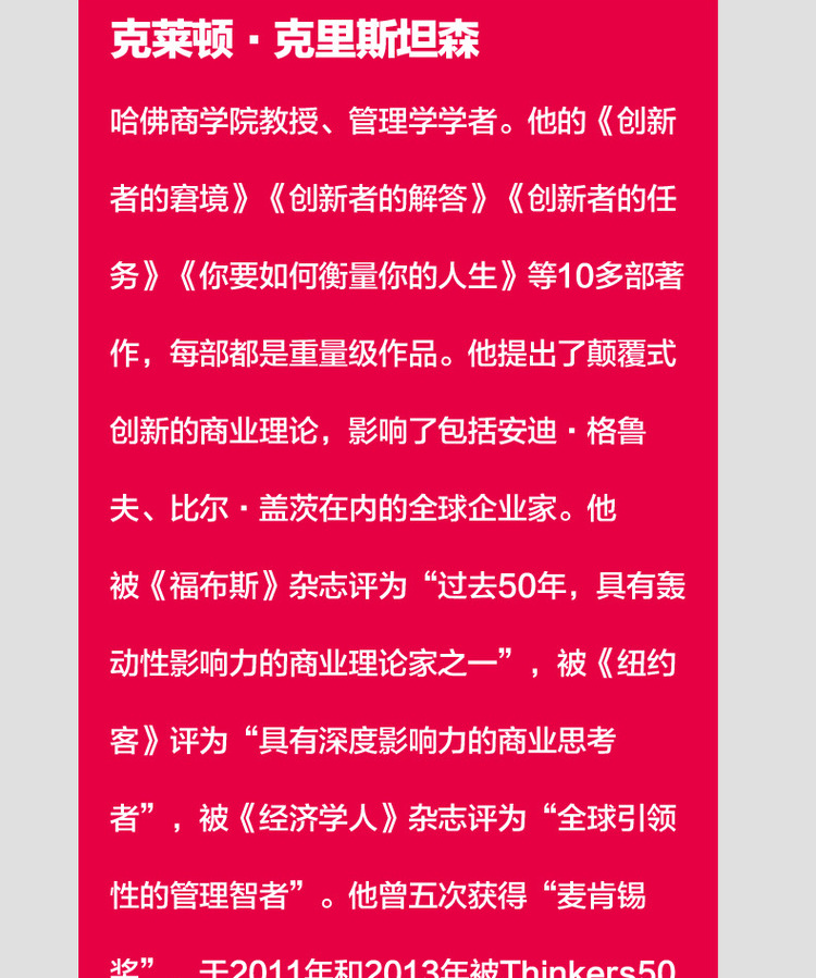 克莱顿克里斯坦森,哈佛商学院的教授、管理学学者。他的《创新者的窘境》《创新者的解答》《你要如何衡量你的人生》等10多部著作,每部都是重量级作品。他提出了颠覆式创新的商业理论,影响了包括迪·格鲁夫、比尔·盖茨在内的全球企业家。他被《福布斯》杂志评为“过去50年,具有轰动性影响力的商业理论家之一”,被《纽约客》评为“具有深度影响力的商业思考者”,被《经济学人》杂志评为“全球引领性的管理智者”。他曾五次获得“麦肯锡奖”,于2011年和2013年被Thinkers50评为“全球50大商业思想家”之一。