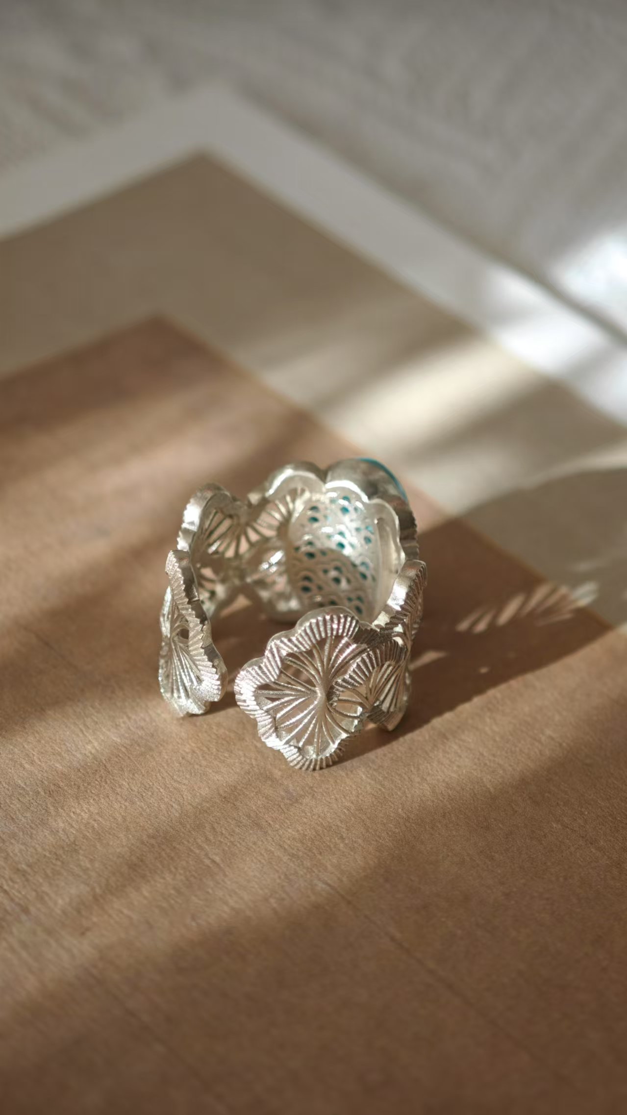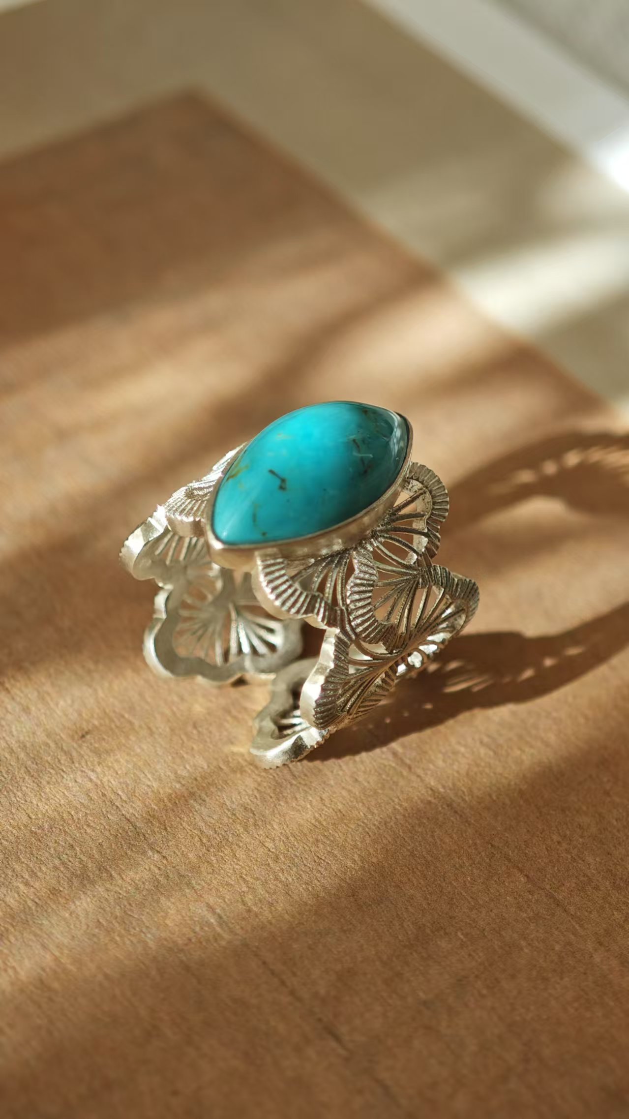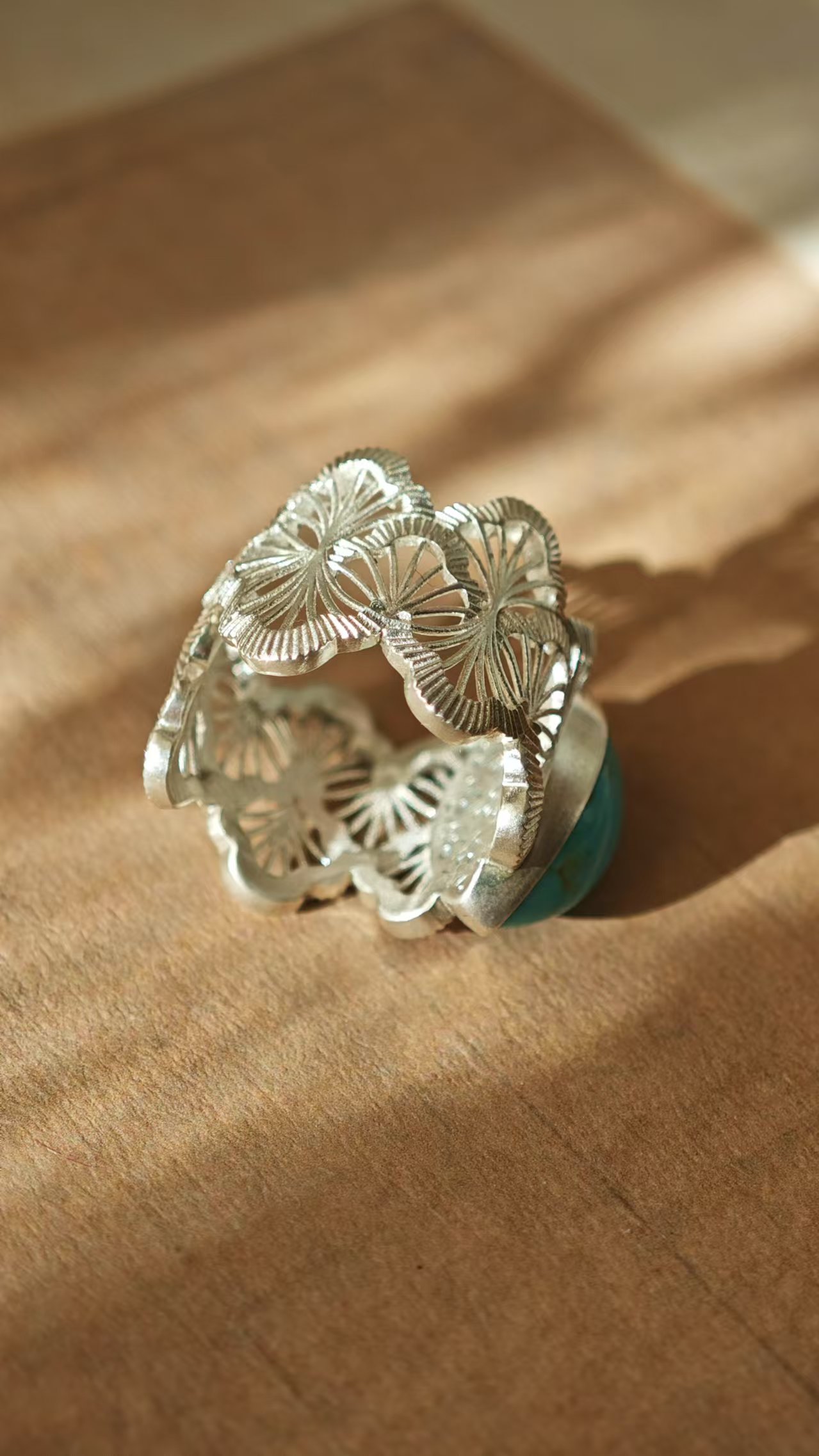 绿松配蕾丝镶边银戒指,