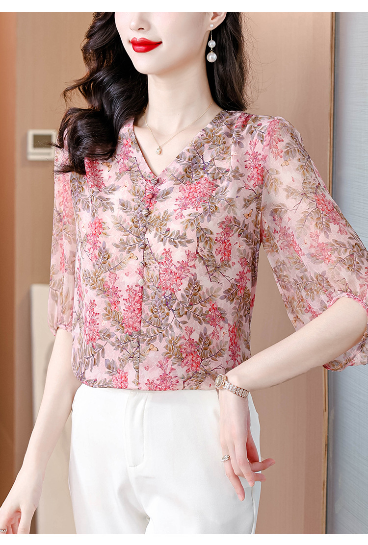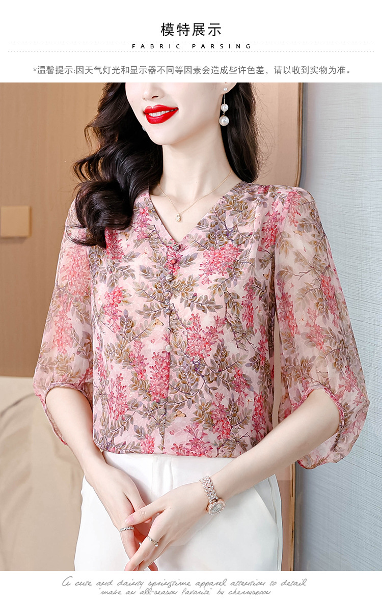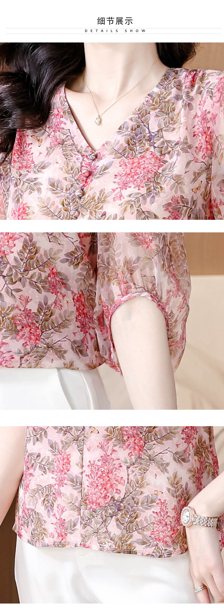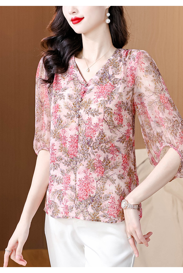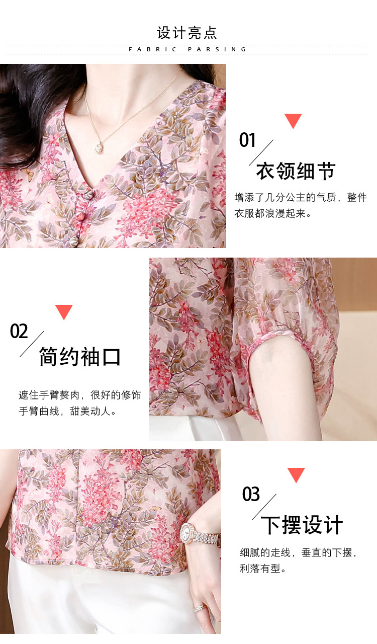 A32467高品质减龄中年女大码遮肉夏新款桑蚕丝真丝衬衫碎花上衣衬衫T恤