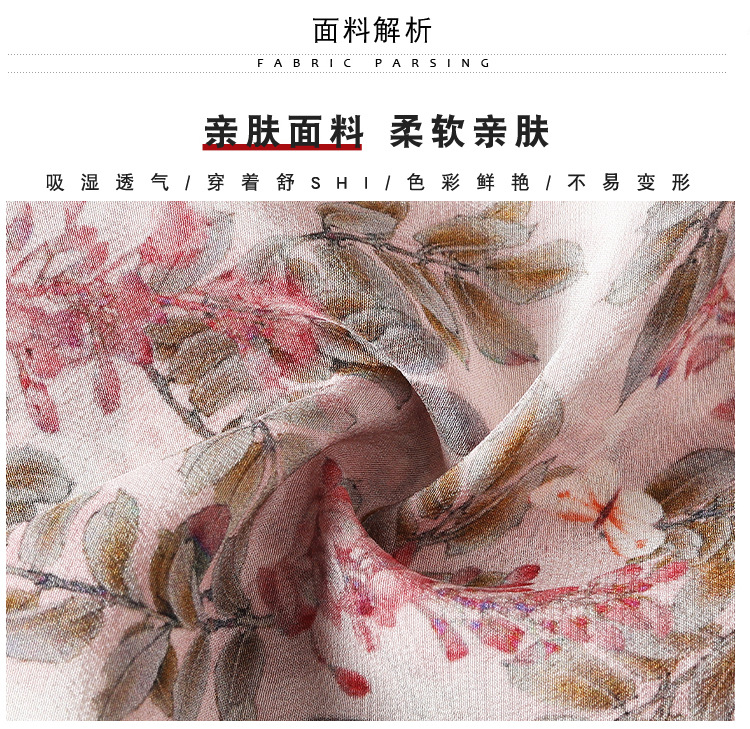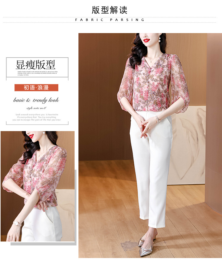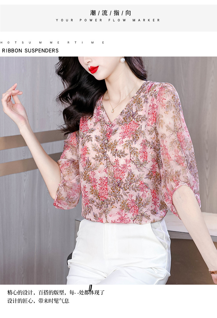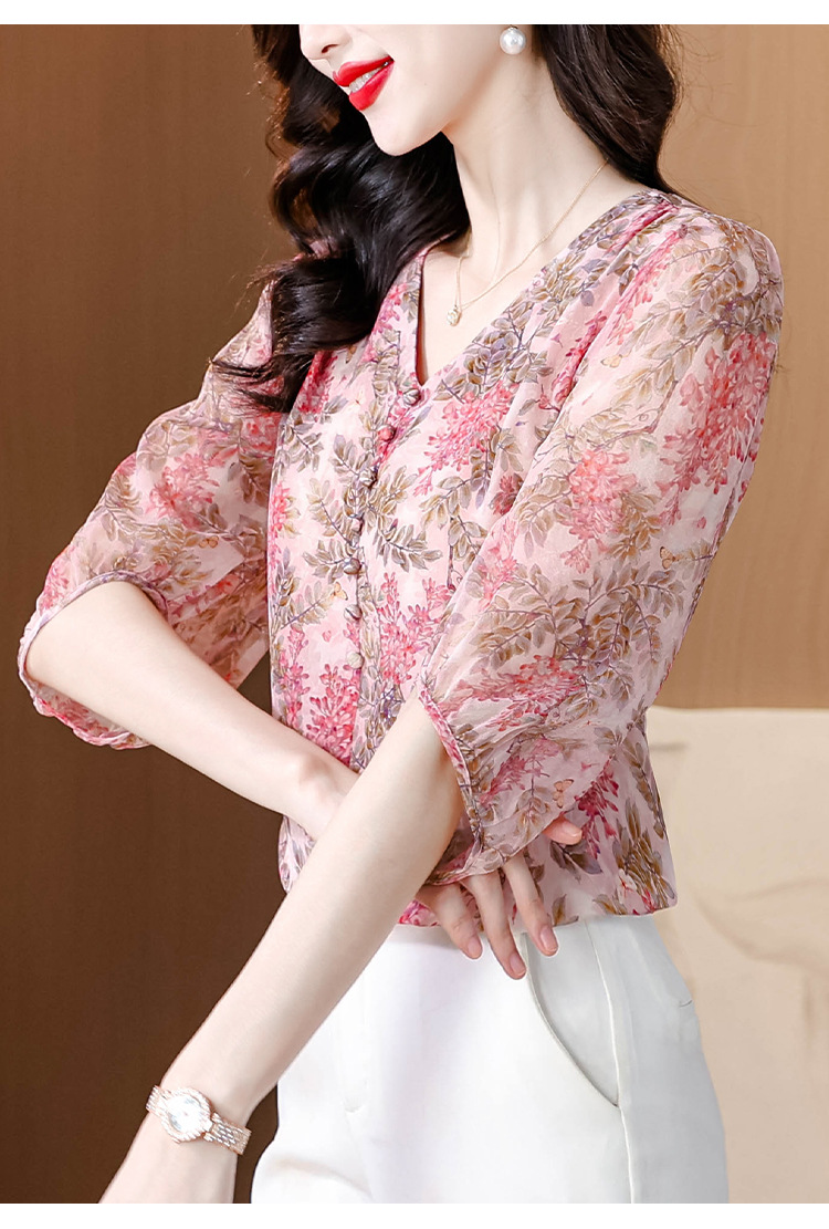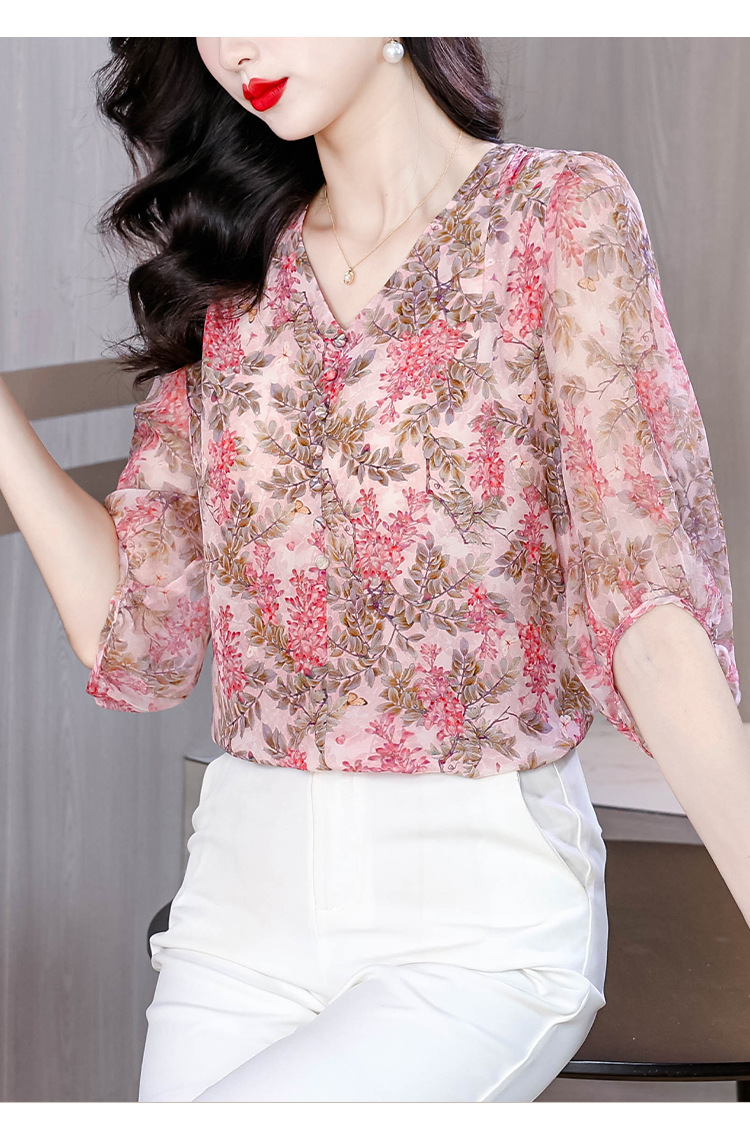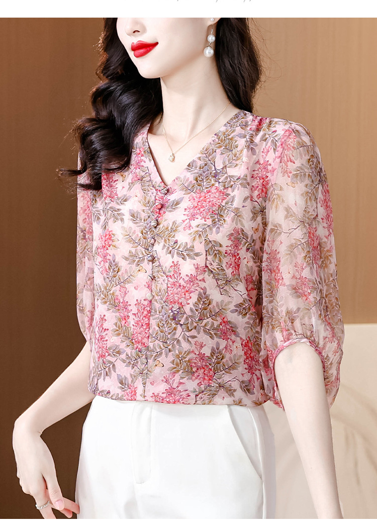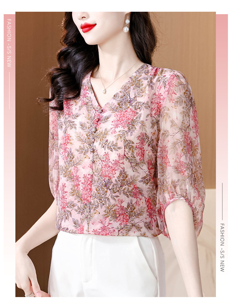 A32467高品质减龄中年女大码遮肉夏新款桑蚕丝真丝衬衫碎花上衣衬衫T恤