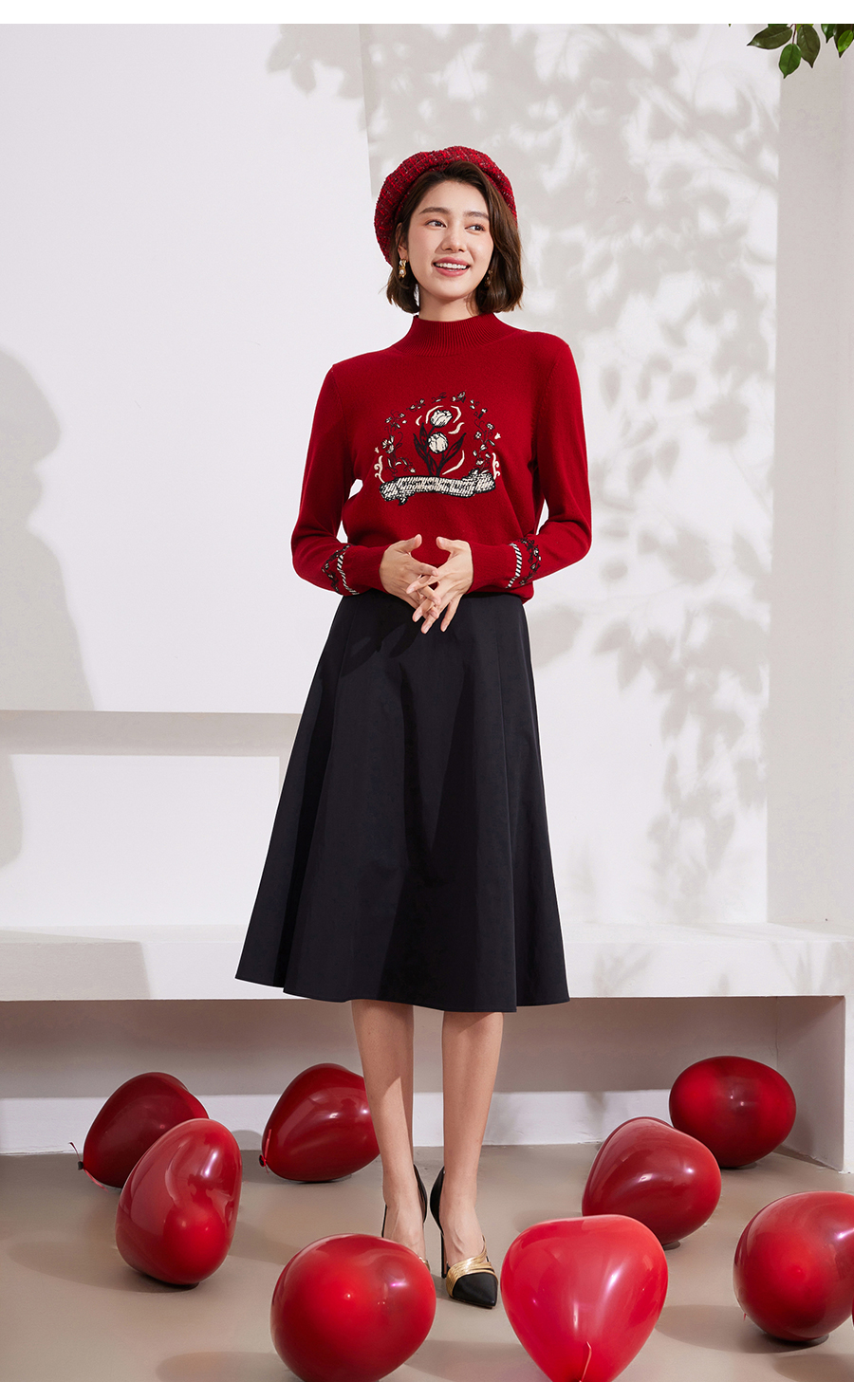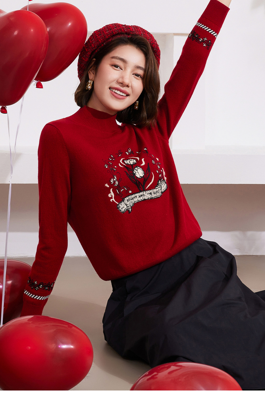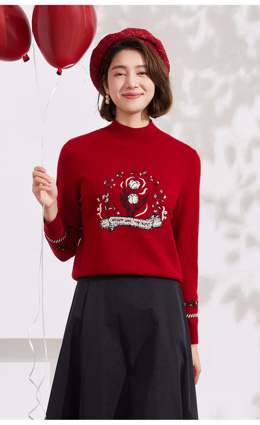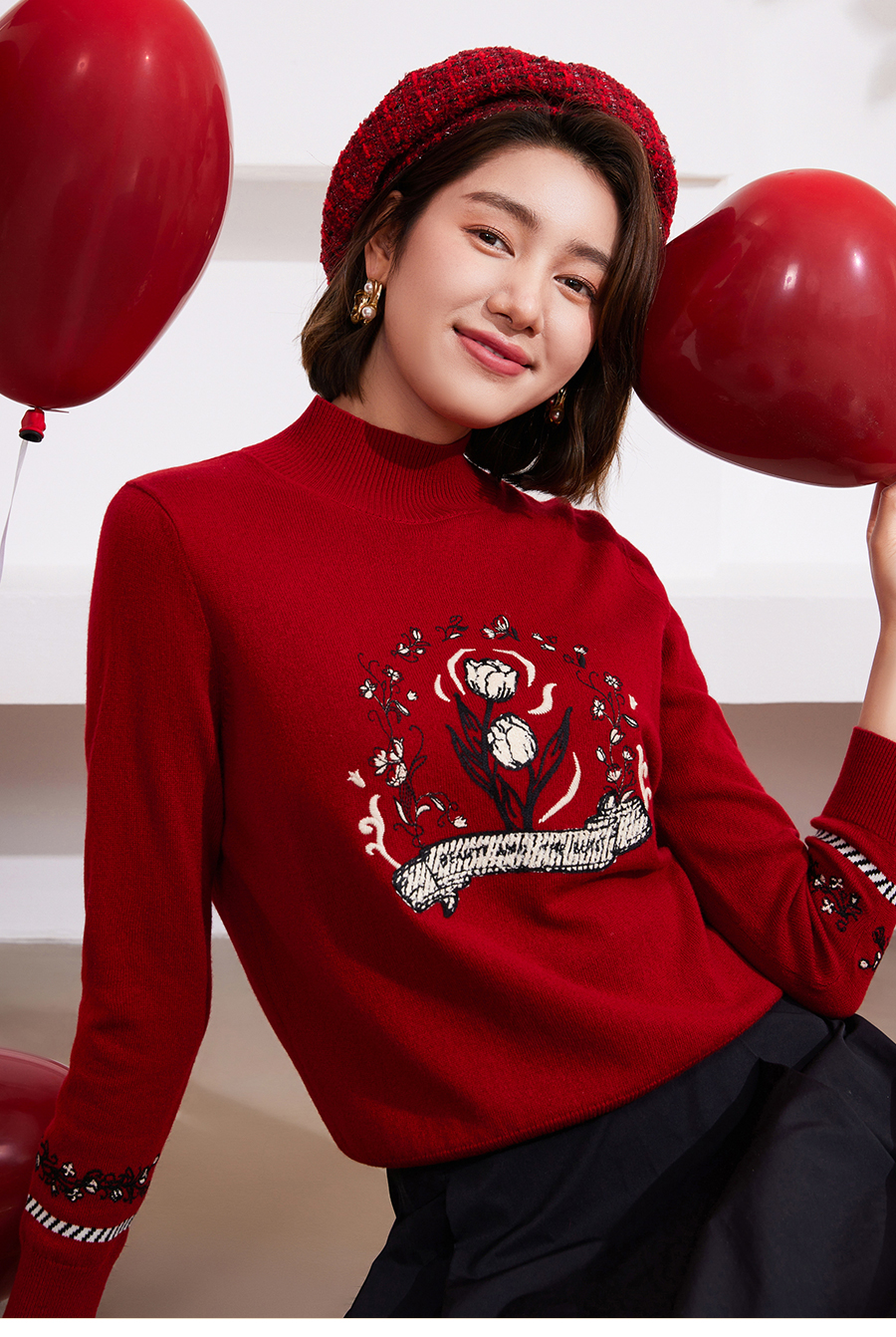 乔万尼正红羊毛针织打底衫温柔知性雅致针织上衣ET4M859