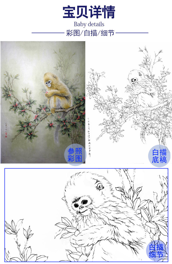 竖幅工笔动物白描底稿-李保山-猴《神秘园》-多种白描尺寸可选-EL22
