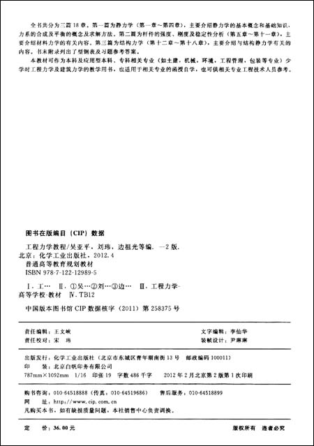 《工程力学教程(第2版)》共分为三篇18章。第一篇为静力学(第一章~第四章),主要介绍静力学的基本概念和基础知识,力系的合成及平衡的概念及求解方法。第二篇为杆件的强度、刚度及稳定性分析(第五章~第十一章),主要介绍材料力学的有关内容。第三篇为结构力学(第十二章~第十八章),主要介绍与结构静力学有关的内容。书末附录列出了型钢表及习题参考答案。
