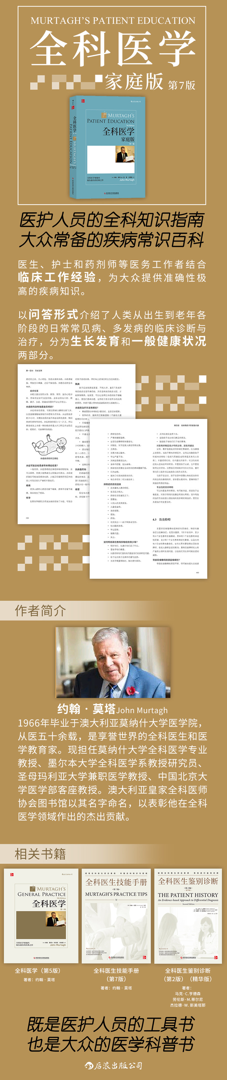 本书是由澳大利亚著名全科医生约翰•莫塔(John Murtagh)结合多年临床工作经验编写而成。以问答形式介绍了人类从出生到老年各阶段的日常常见病、多发病的临床诊断与治疗,分为生长发育和一般健康状况两部分。其中,生长发育部分介绍了婚姻、妊娠与产后照顾、儿童和青少年健康相关问题、女性健康问题等内容;一般健康状况部分介绍了传染性疾病、眼科疾病、骨骼肌肉疾病等常见疾病。