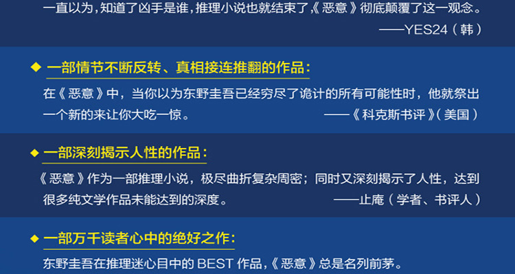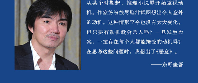 ★东野圭吾在《恶意》中巧妙地设置了一个又一个反转,从阴谋实施到真相大白间的精巧设计,令读者赞叹不已。《出版家周刊》(美国)
