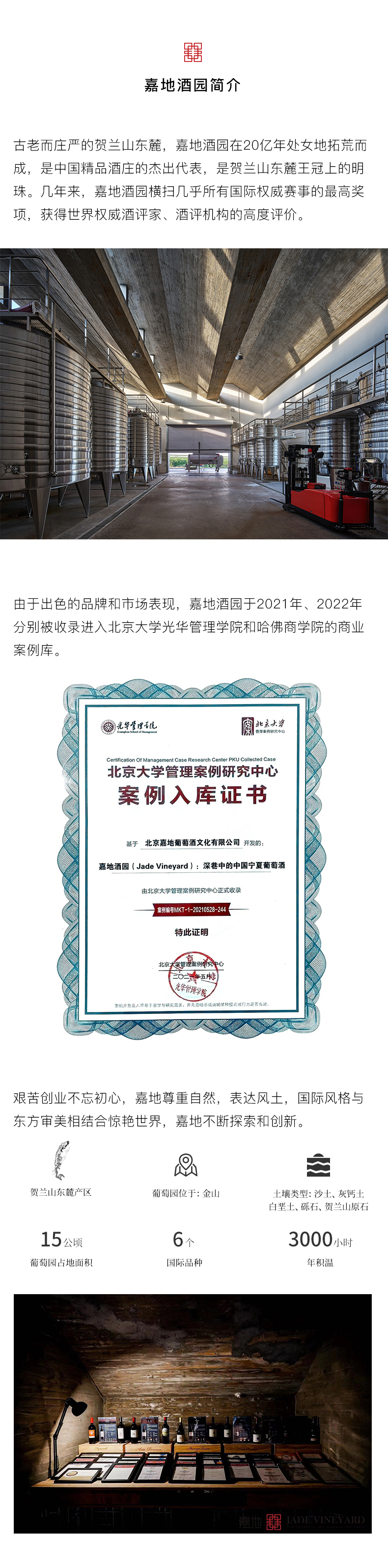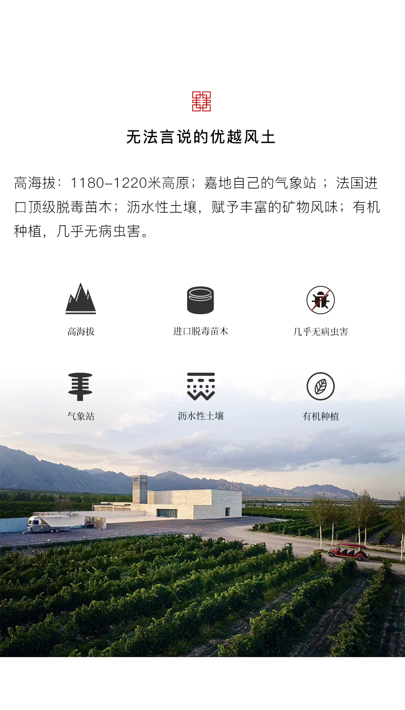 嘉地酒园,英文名称 Jade Vineyard 寓意一块美玉,坐落在银川贺兰山东麓。作为中国新兴精品酒庄,怀揣着要做中国顶级葡萄酒的梦想。