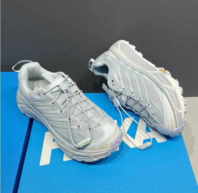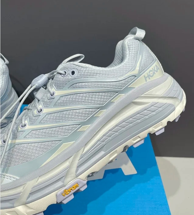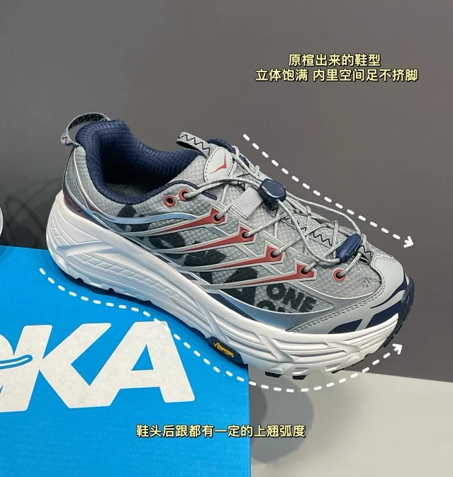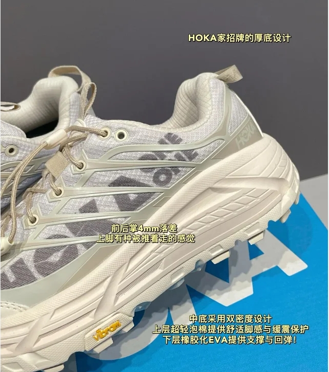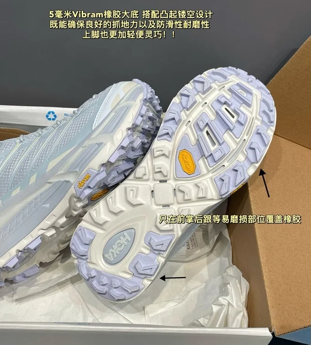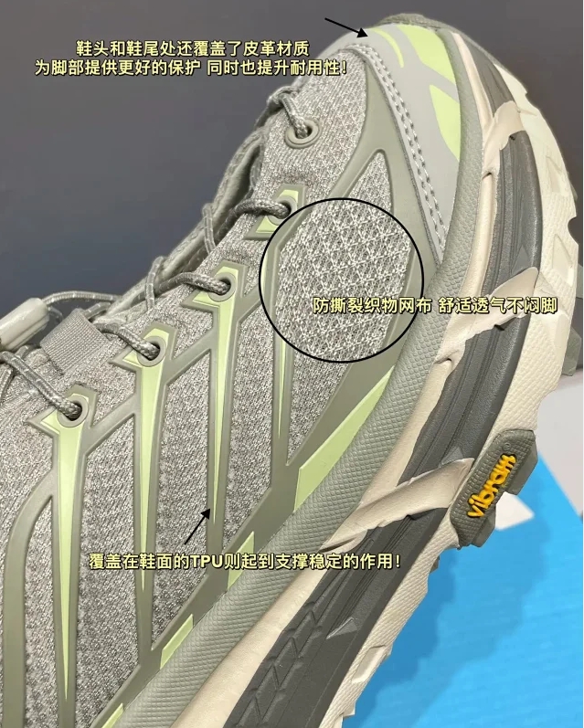 防撕裂轻量无缝鞋面配合TPU支撑条加强 轻薄又透气!穿脱方便的抽拉式快速系带系统!加上HOKA招牌的厚底设计 能够起到很好的缓冲减震效果!还有5毫米专业Vibram橡胶大底 提供充足抓地力!
