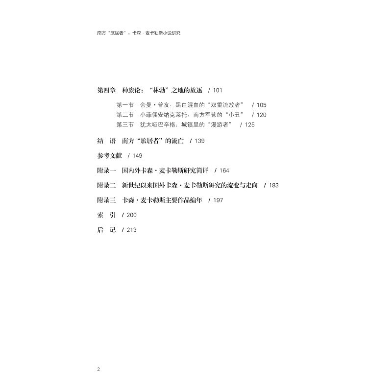 本书以美国南方女作家卡森·麦卡勒斯的小说为研究对象,重点关注她的五部代表作《心是孤独的猎手》《金色眼睛的映像》《伤心咖啡馆之歌》《婚礼的成员》和《没有指针的钟》。本书将麦卡勒斯的小说研究置于美国南方的社会、历史、文化的语境下,广泛运用生平传记研究、空间批评、文化地理学、性别研究、文化诗学、心理分析、狂欢诗学等理论和方法,以南方“旅居者”为研究切入点,从成长论、空间论、性别论和种族论这四个层面,来探寻麦卡勒斯的文学身份归属,以及小说中“南方性”的文学本质和意蕴。
