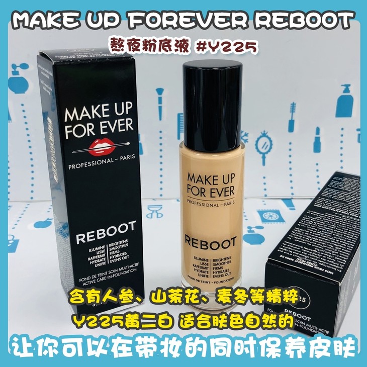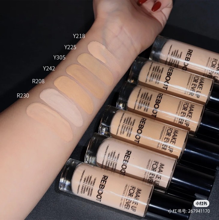 MAKE UP FOREVER REBOOT 熬夜粉底液 👍有玫珂菲赋活焕彩粉底液,熬夜再也不怕了,🍃上脸即可一扫倦容脸。还含有人参、山茶花、麦冬等精粹,🌿让你可以在带妆的同时保养皮肤。精华般的超丝滑质地包裹你的肌肤,💫带给肌肤舒适感受,有效修饰暗沉肌肤,隐匿瑕疵,🎐贴合肌肤妆效持久。黑色泵头,方便卫生便于取量,💭玻璃瓶身,色号显而易见。推荐干皮或混皮。Y开头为黄调,R开头为粉调;🌱Y225黄二白,适合肤色自然的;R230粉二白,适合皮肤偏白的冷皮或中性皮肤。🍁