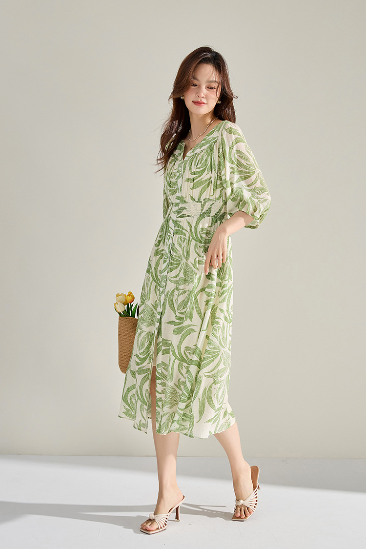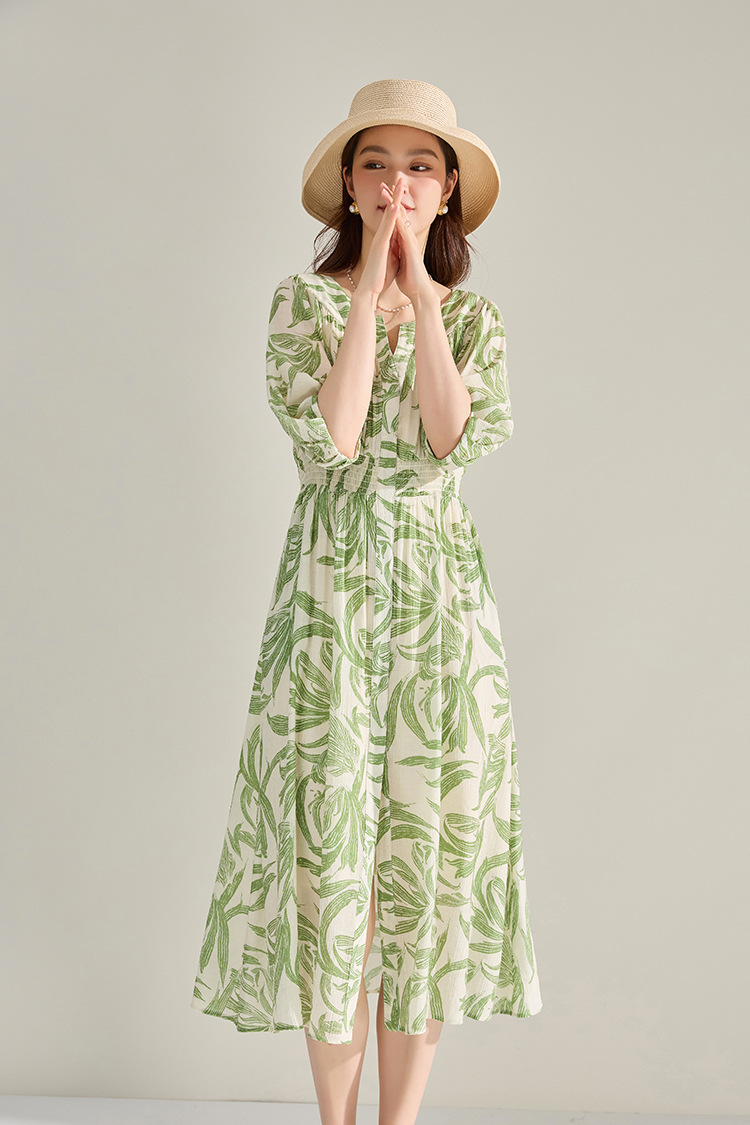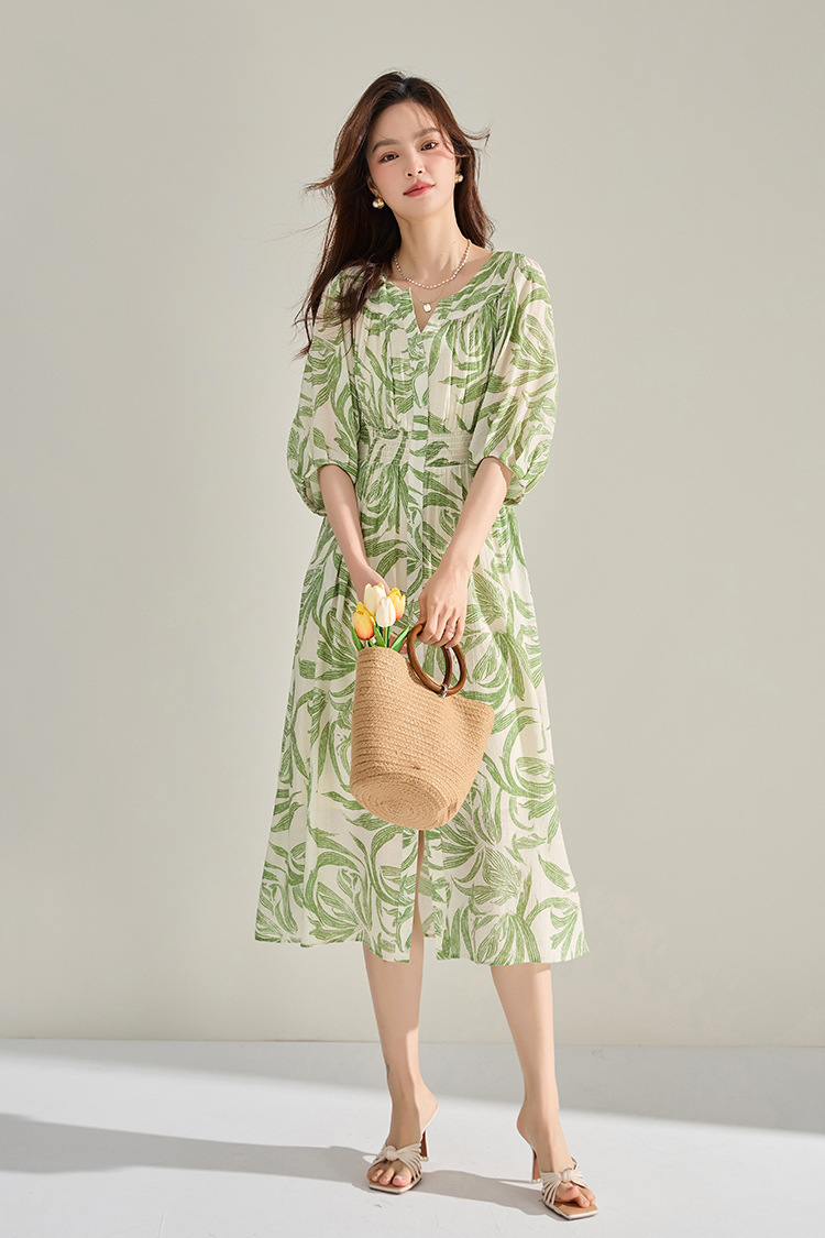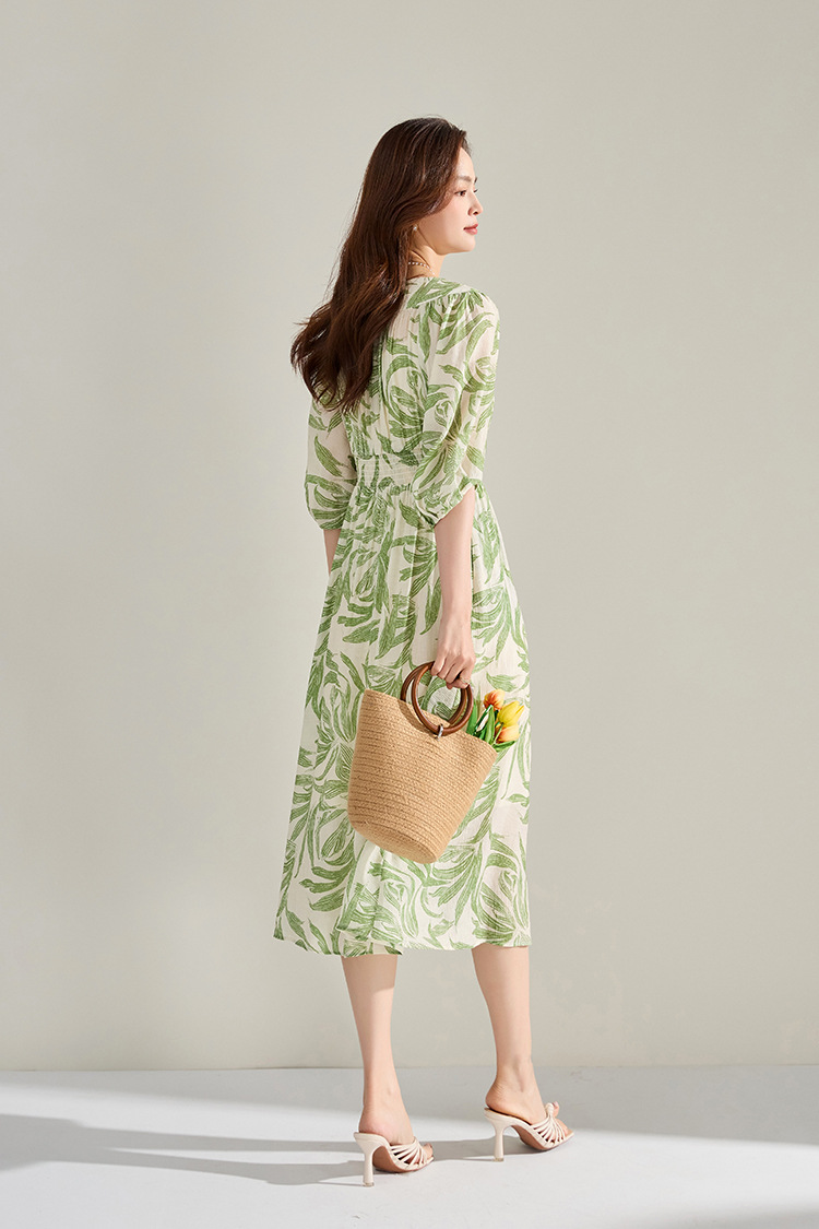 丁摩 夏法式V领清新绿色印花连衣裙灯笼袖收腰开叉度假风长裙5ZF-15695