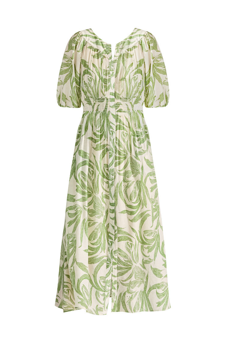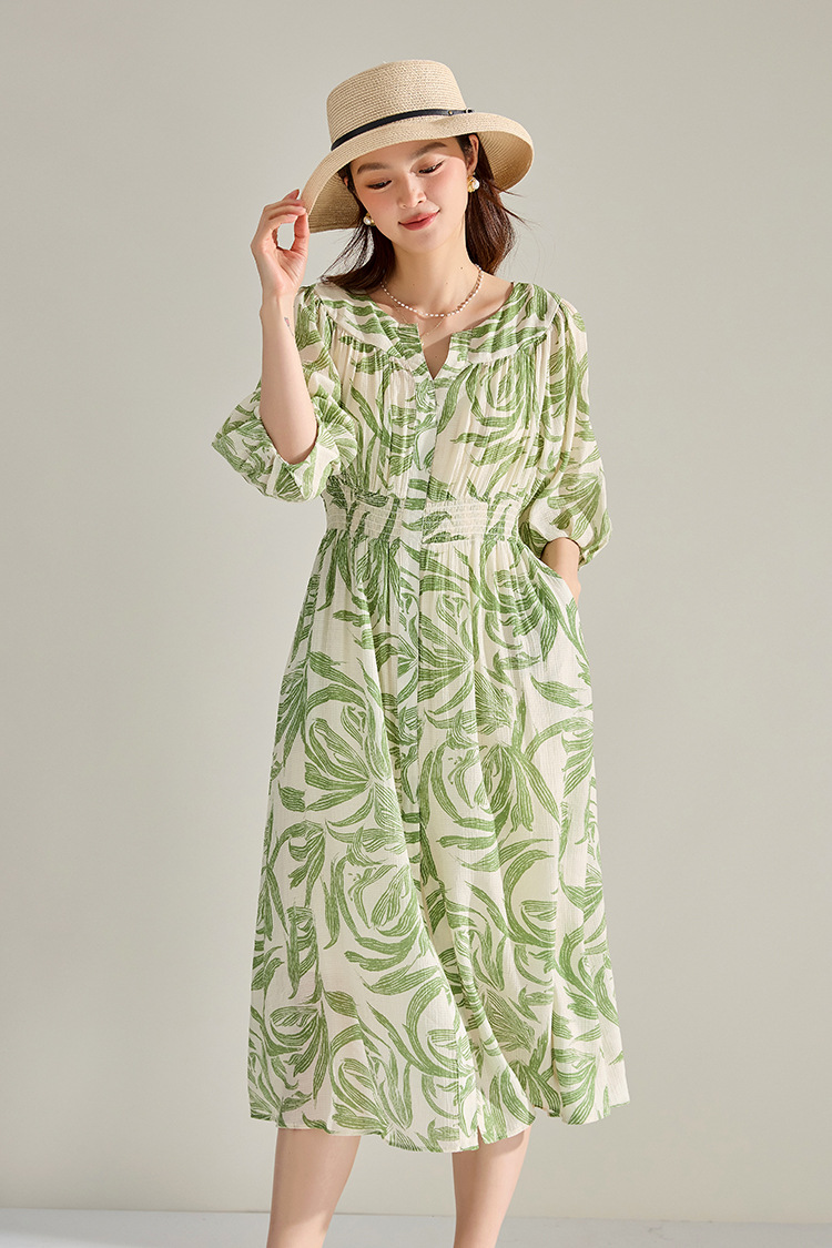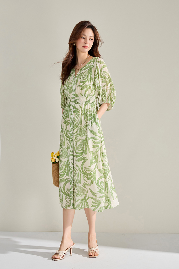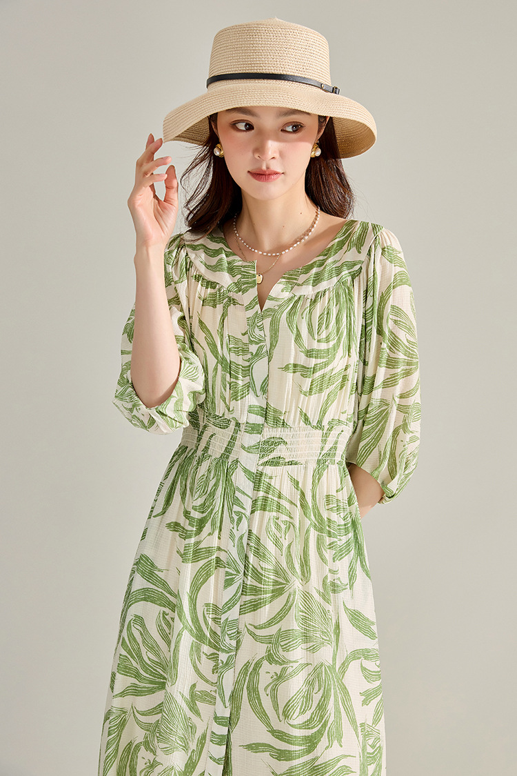 丁摩 夏法式V领清新绿色印花连衣裙灯笼袖收腰开叉度假风长裙5ZF-15695