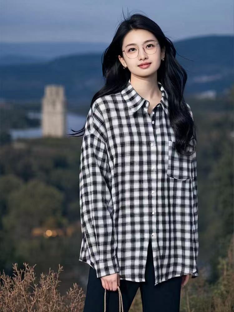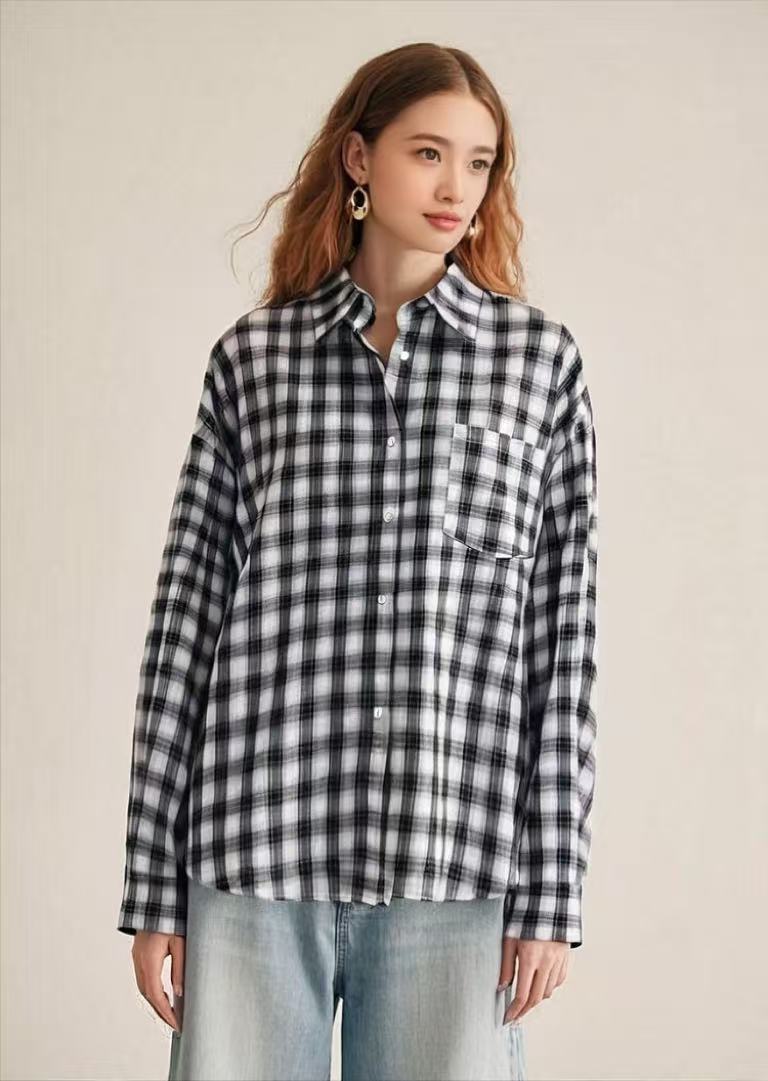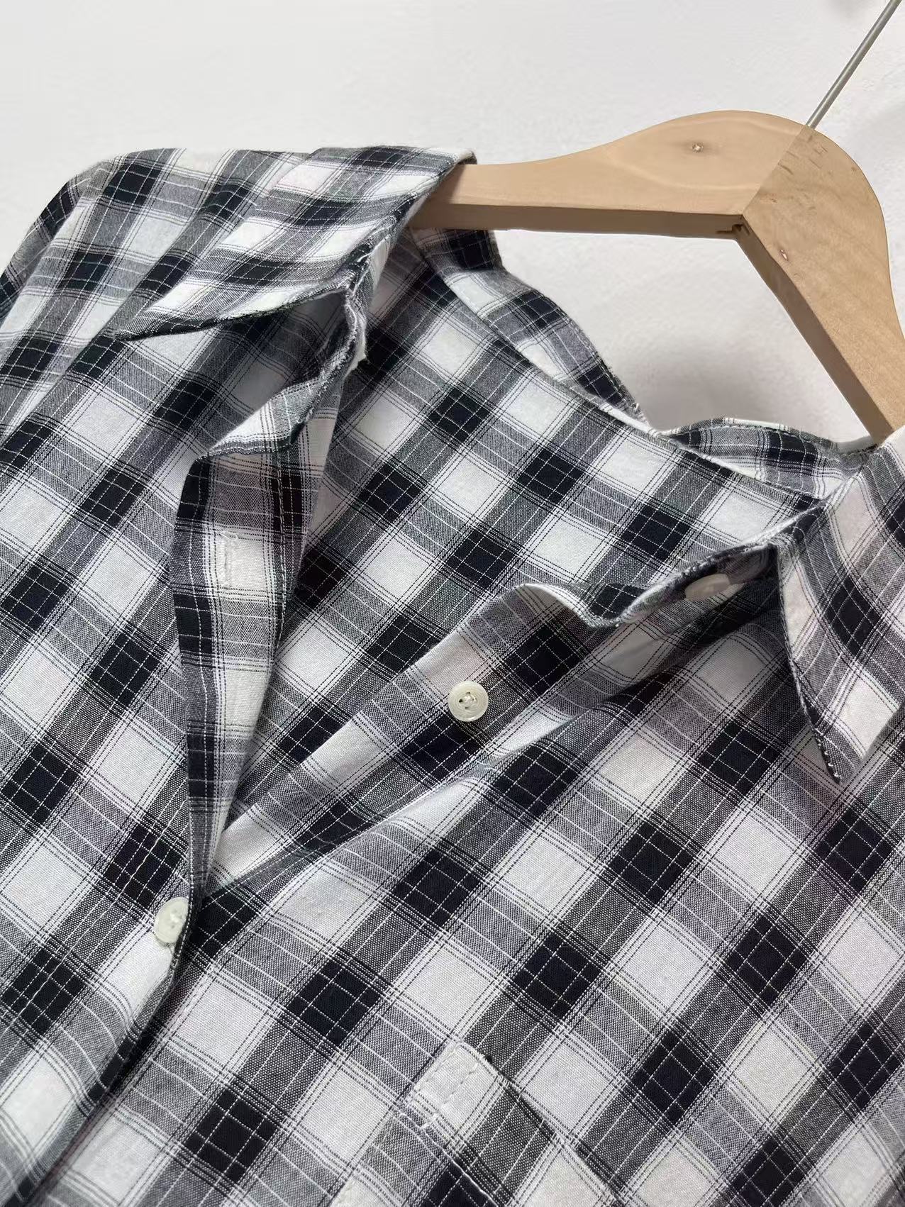 【秋新品】古泥7558 100%棉薄款黑白格衬衫-喜出