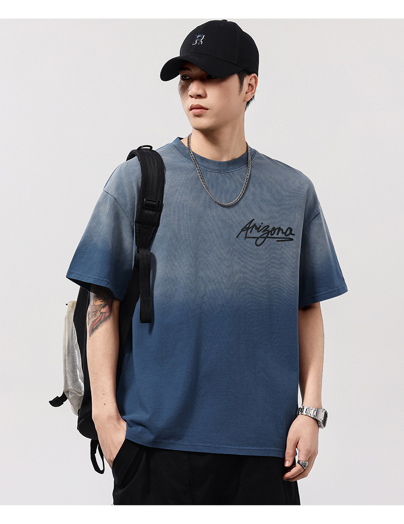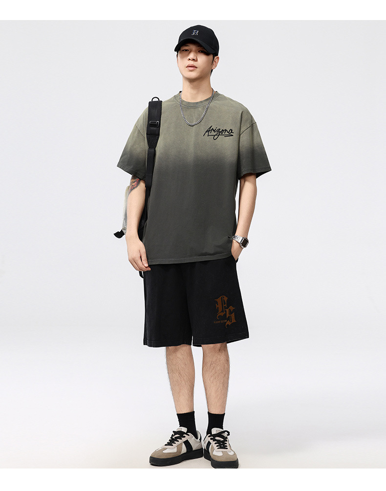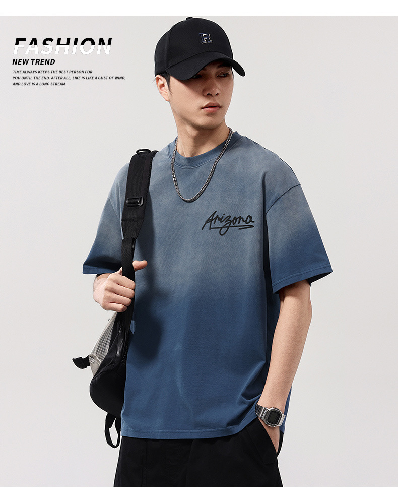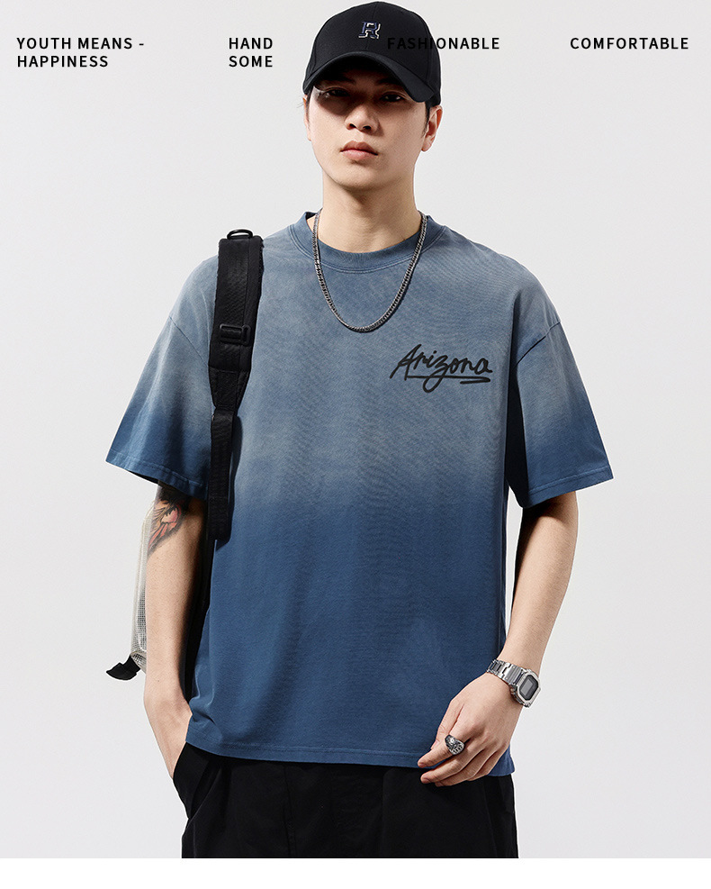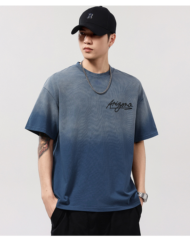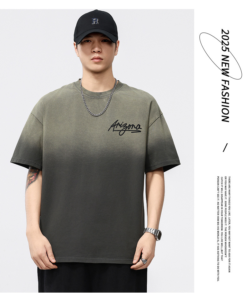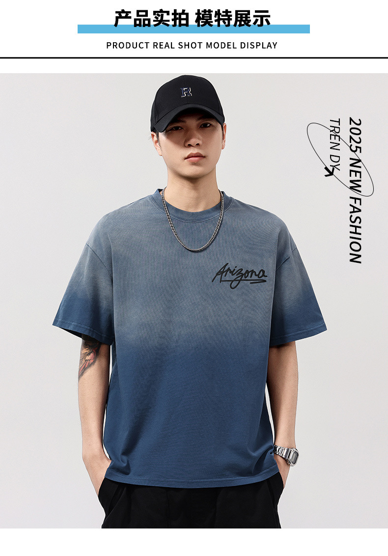 【100%棉】【DQ】大依优型大码男装染洗渐变圆领T恤男260G重磅宽松印花短袖半袖夏季新品上衣男士胖子潮流