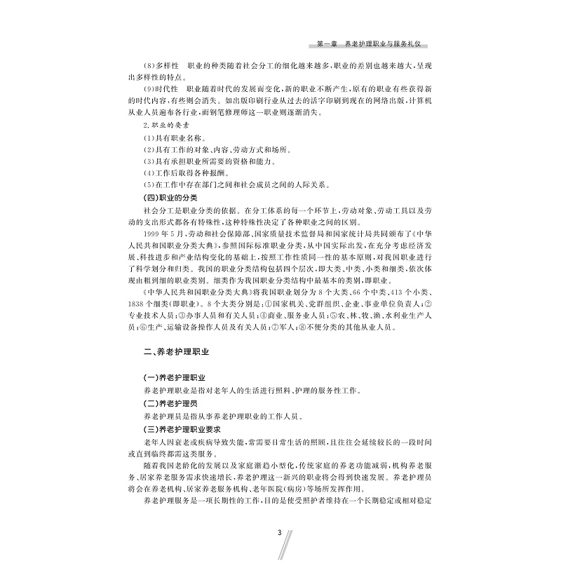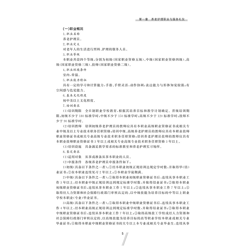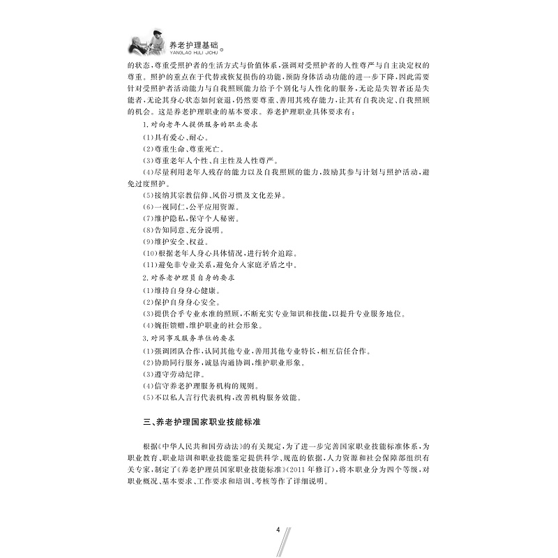 《高等院校老年服务与管理专业规划教材》之一。以养老护理员国家职业标准的理论要求为基础,主要介绍养老护理职业、人体结构、老年人生理特点、失能与失智老人日常照护的基础知识。全书包括养老护理职业与职业道德、人体结构及功能、老年人身心特点及日常照护、失能老年人长期照护、失智老年人长期照护、老年人生命活动观察与应急救护、养老护理管理。该教材与《养老护理操作规程》配套,作为养老护理员(初级、中级、高级)的职业培训和鉴定用书。