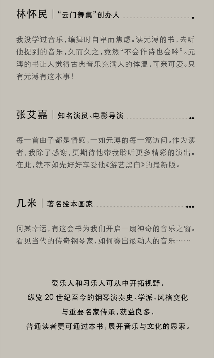 至本册第二部分,更收录了更年轻的、比例极高的亚洲钢琴家访问。亚洲有属于自己的欣赏角度与聆听观点,我们更该有属于自己的声音。这并非要扭曲西方经典音乐,或恣意比附解释,而是在努力深入了解后,以我们的文化丰富古典音乐的内涵,为这门艺术开创更宽广的表现可能,探索更深邃的精神层次。他们代表了古典音乐的现在,也将成为这部正在发生的古典音乐史的未来。