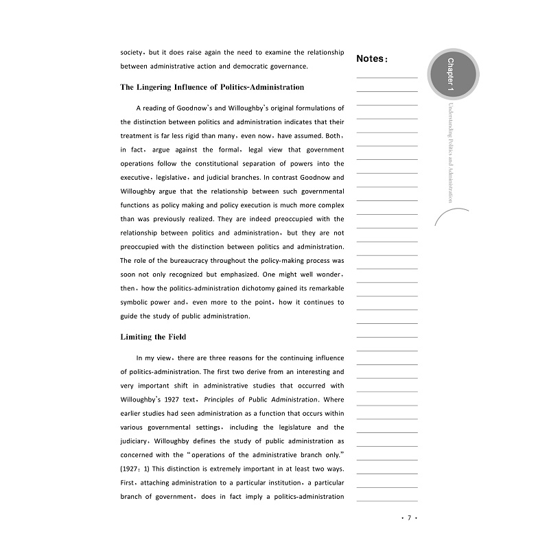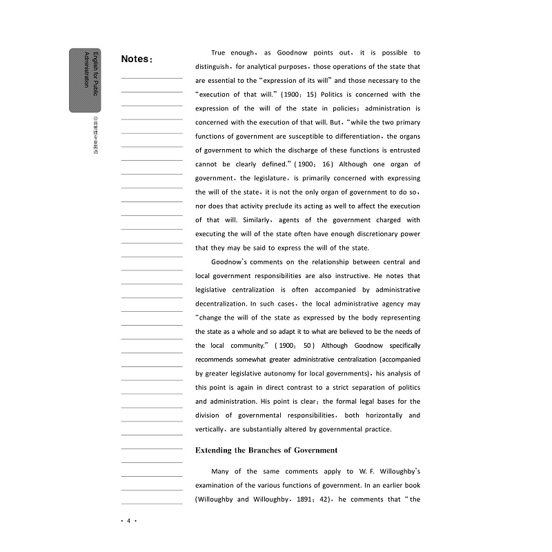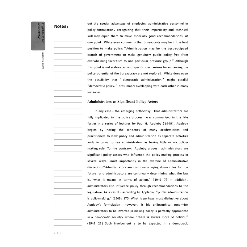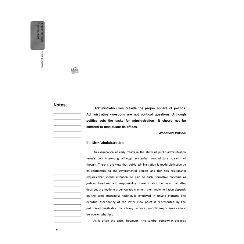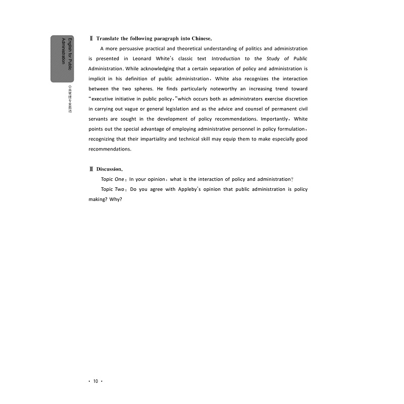 适用于公共管理专业本科生专业英语,在选材方面,涉及内容将涵盖各相关专业的基本知识,包括公共管理理论、电子政府、公共部门人力资源管理、公共部门机构设置与改革、公共部门危机管理、非营利组织管理、公共政策、公共预算等内容。