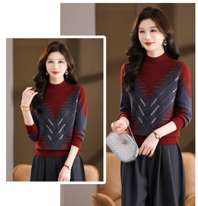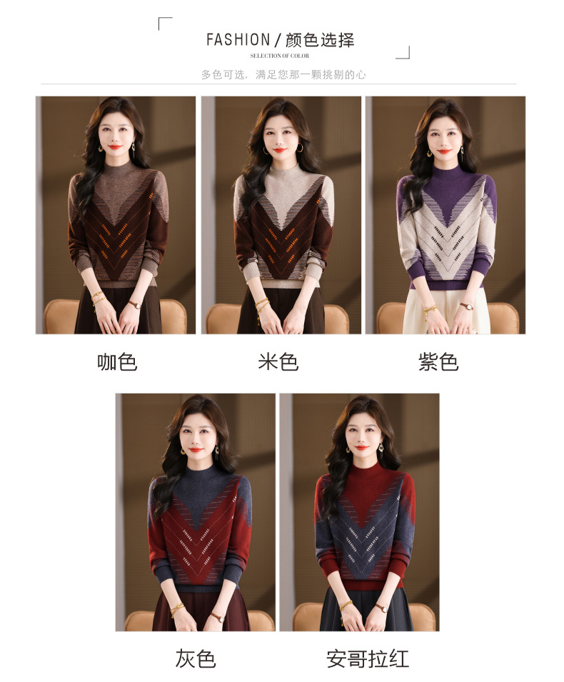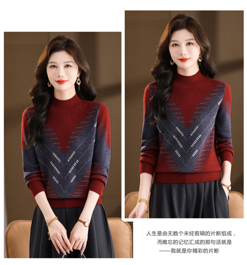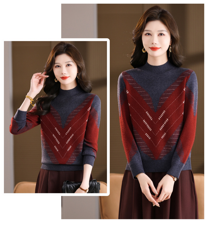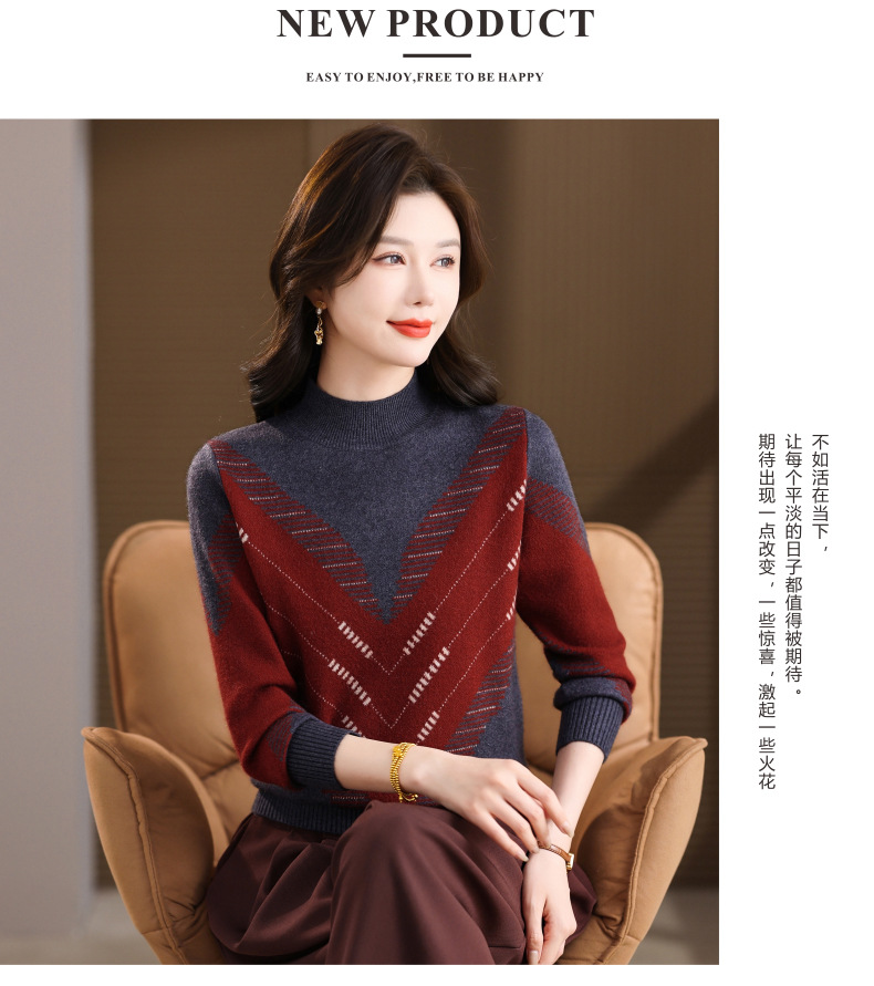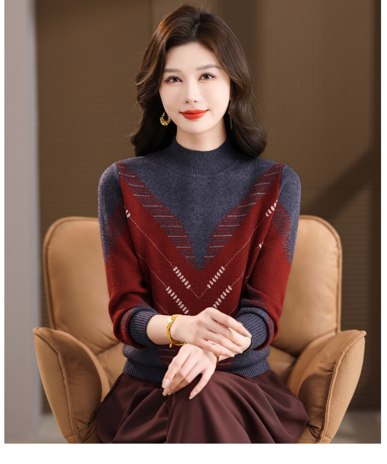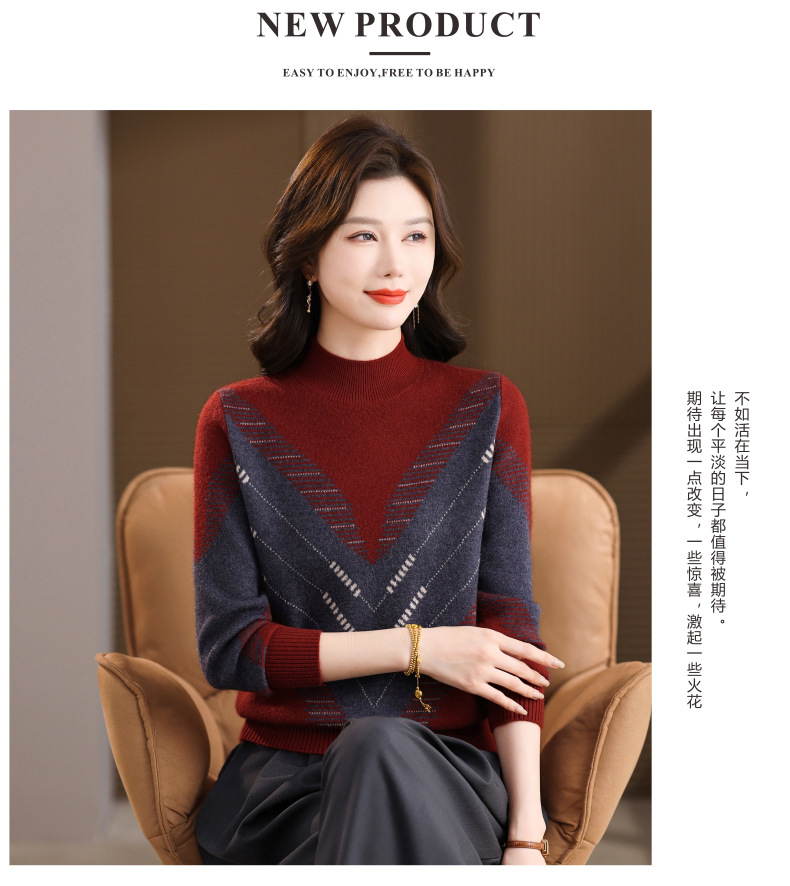 CC2025秋冬半高领撞色菱形提花毛衣女短款长袖针织衫保暖内搭打底衫