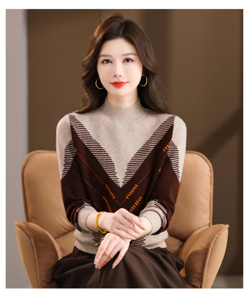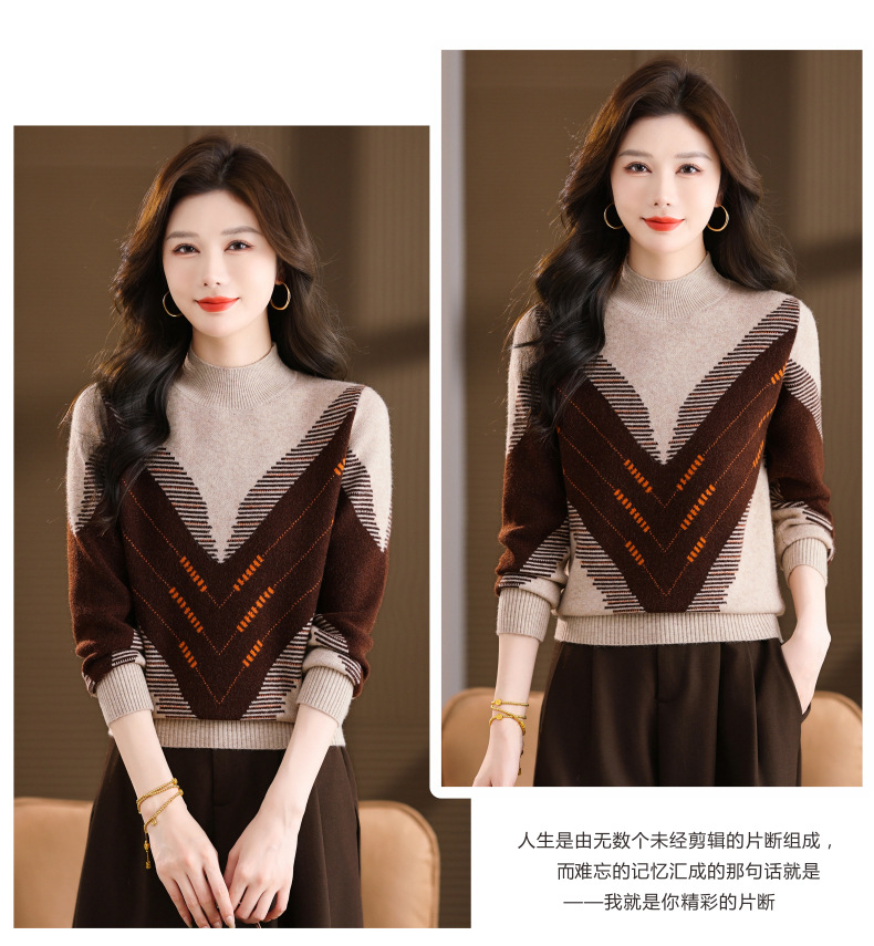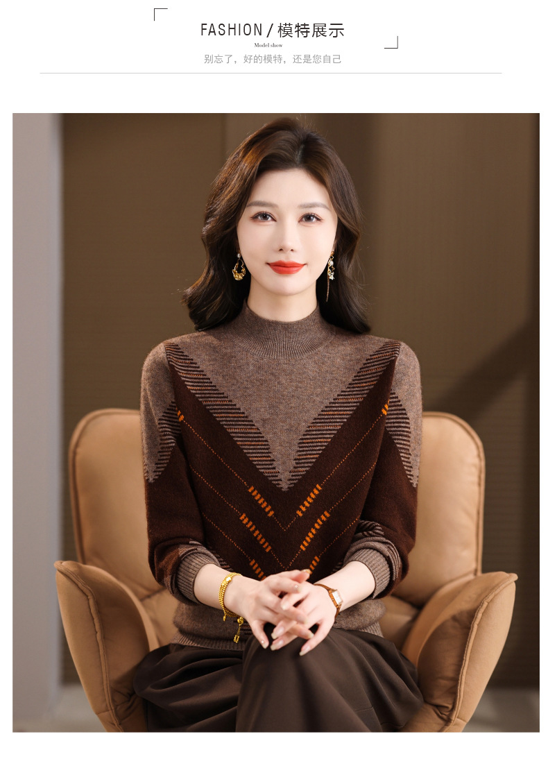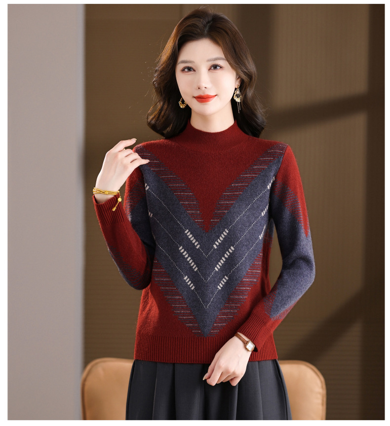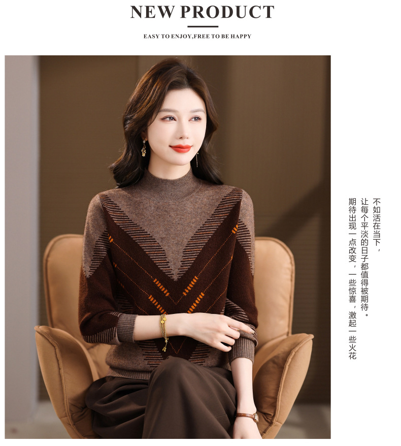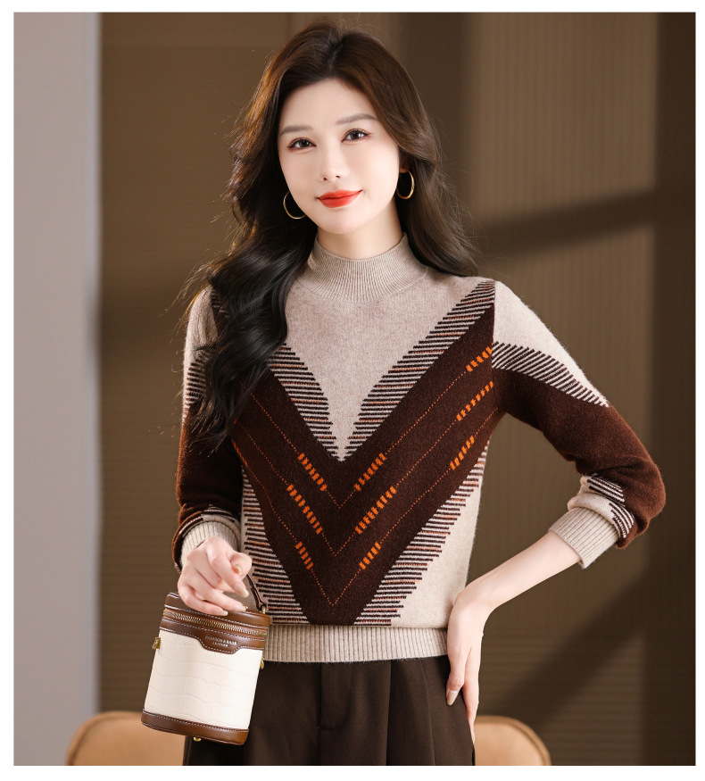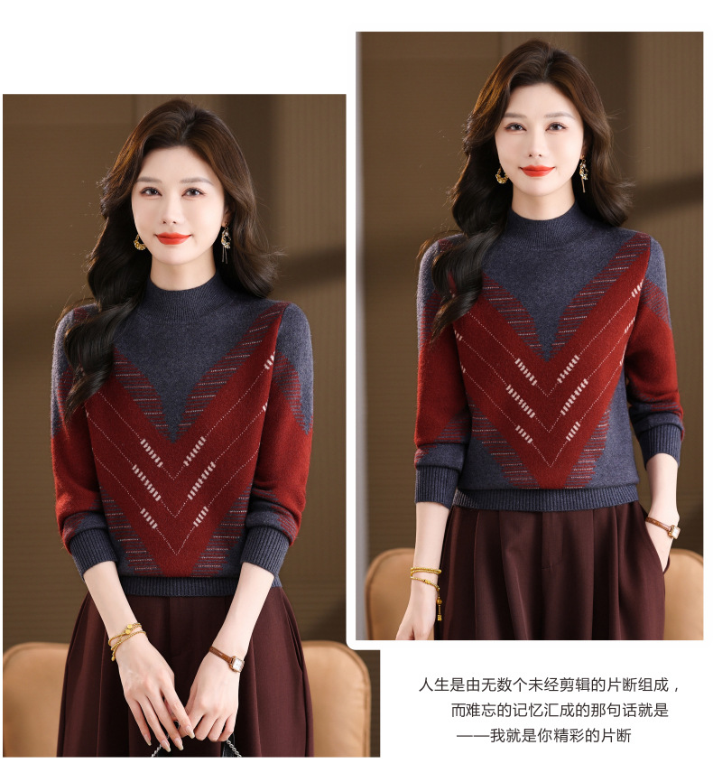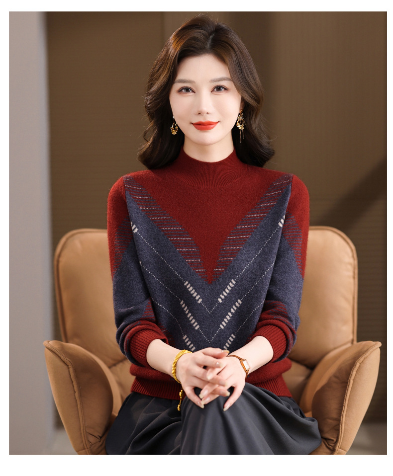 CC2025秋冬半高领撞色菱形提花毛衣女短款长袖针织衫保暖内搭打底衫