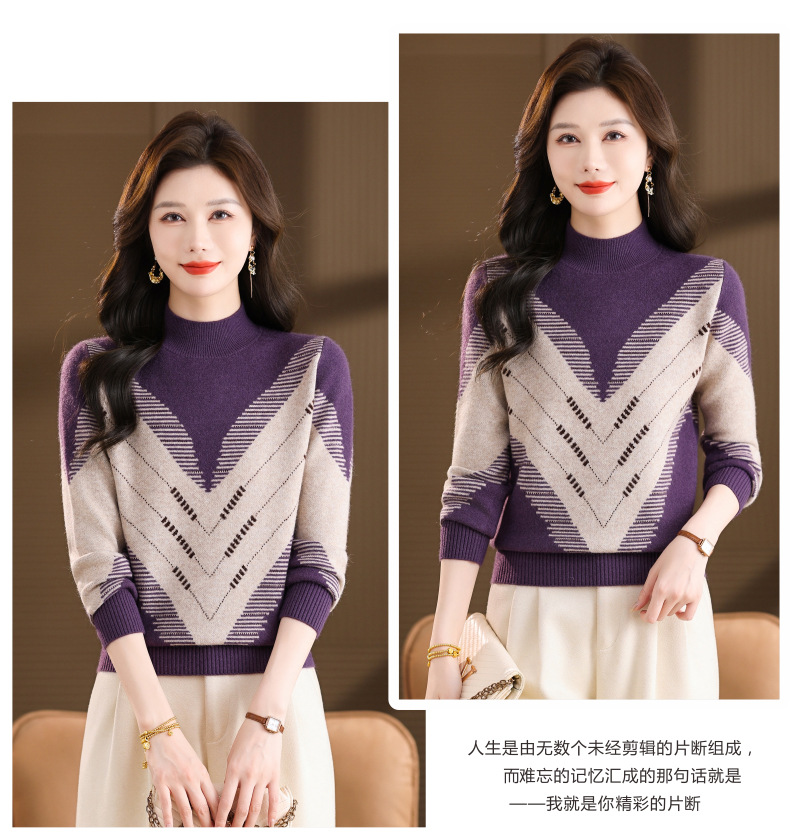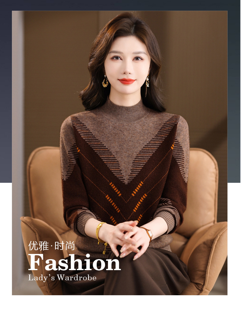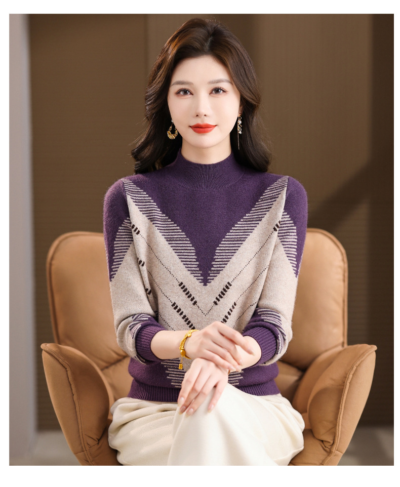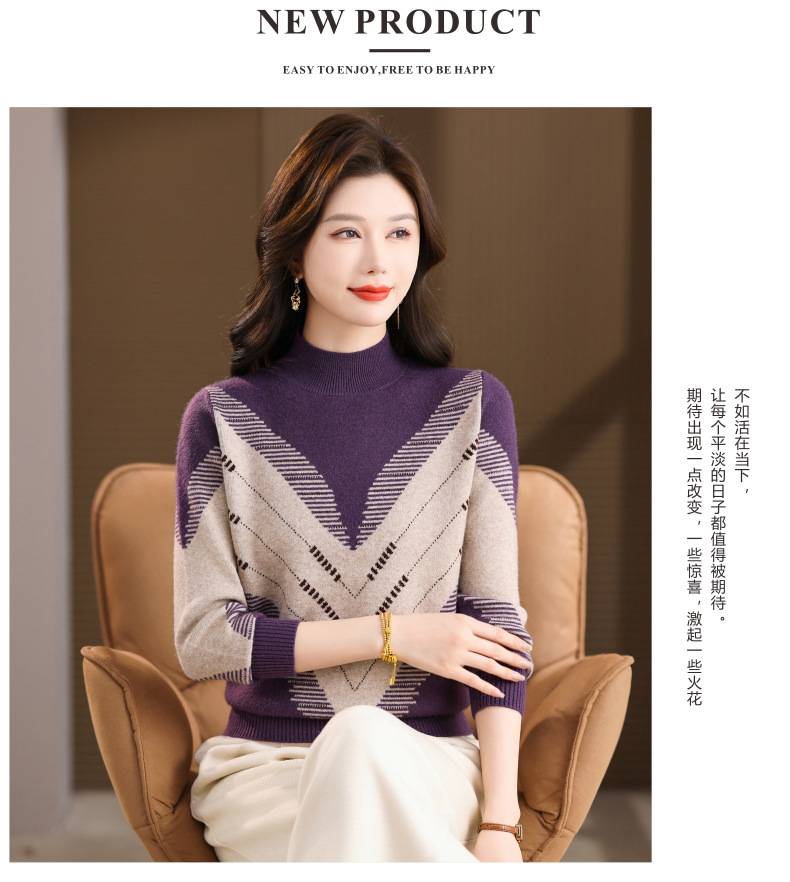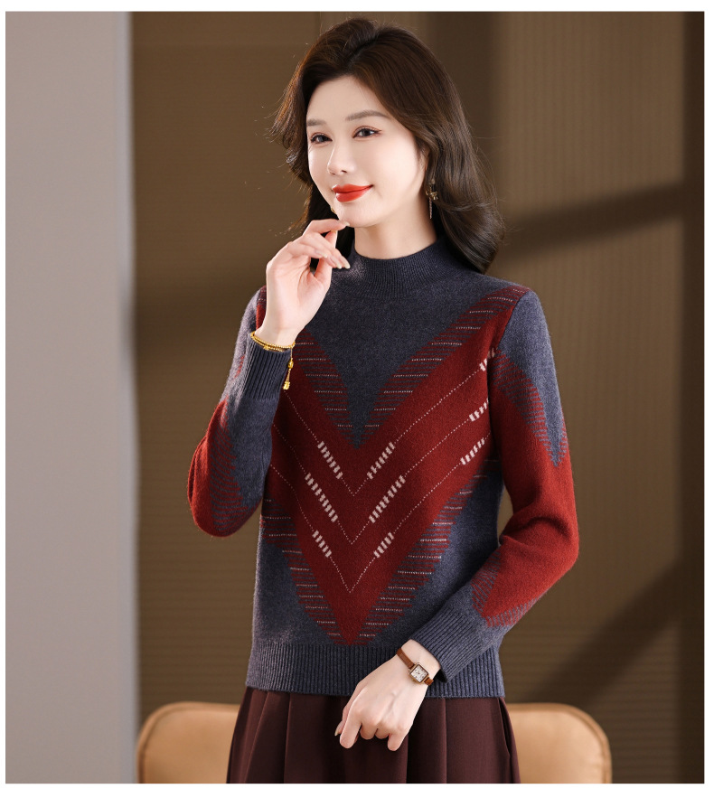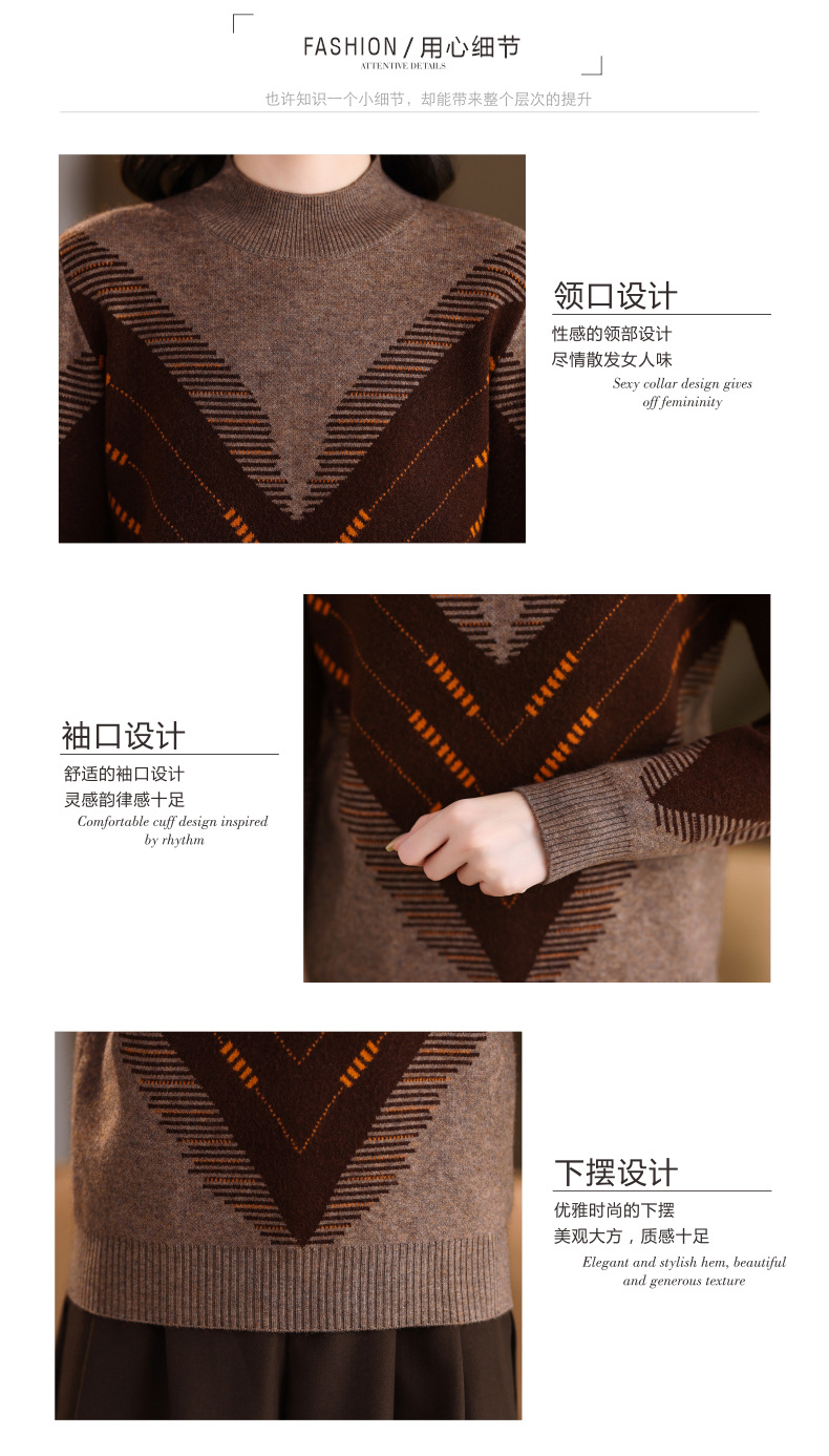 CC2025秋冬半高领撞色菱形提花毛衣女短款长袖针织衫保暖内搭打底衫