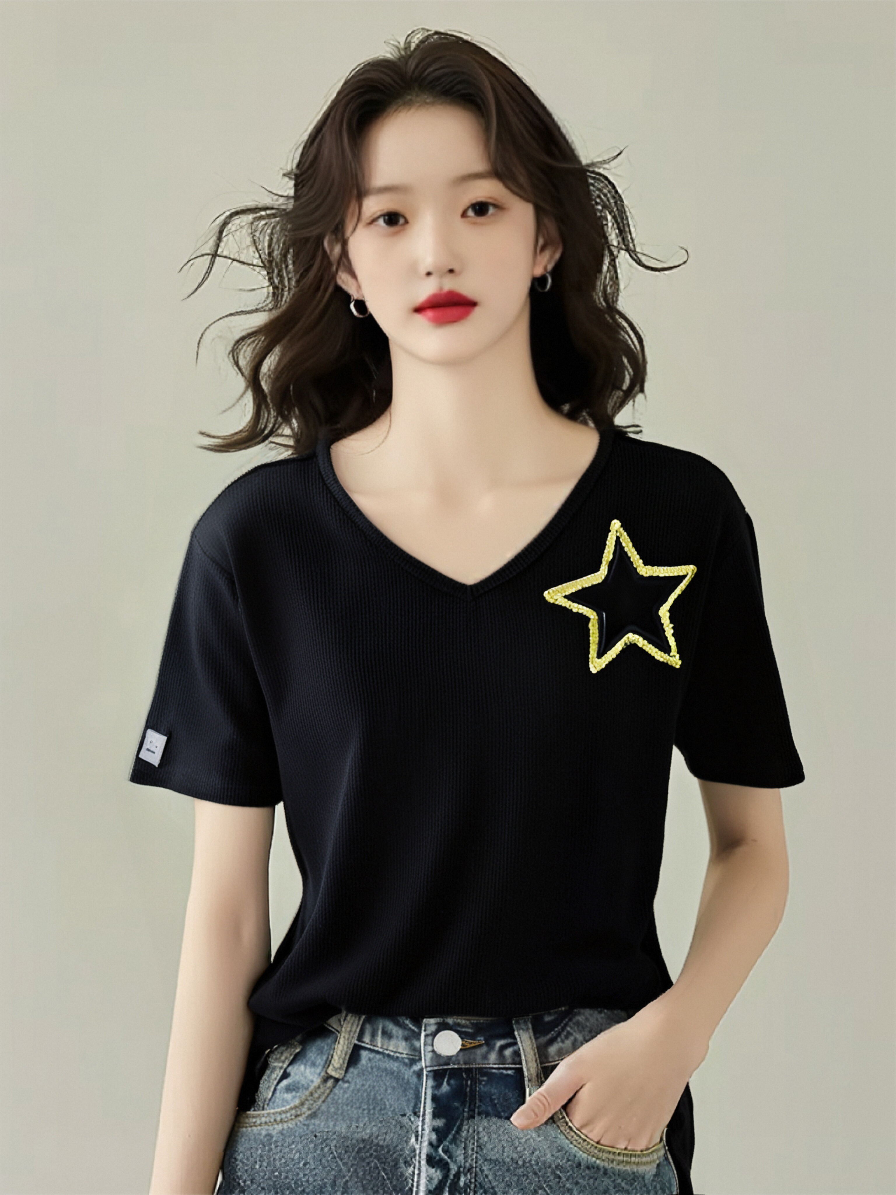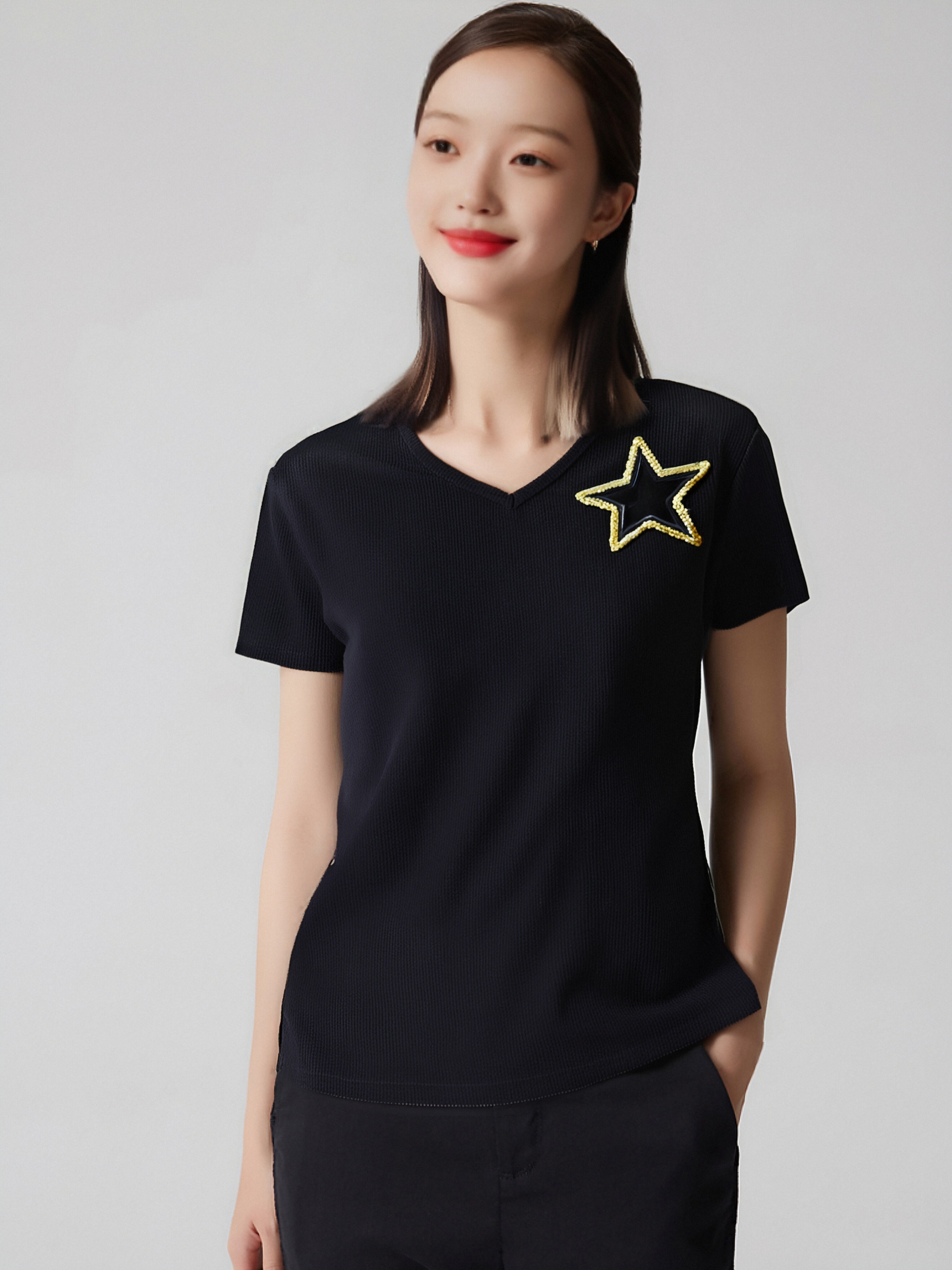 超值购【诗铭洛可】6177 针织T恤亮片星星(胳膊笑脸标染色)A8-1