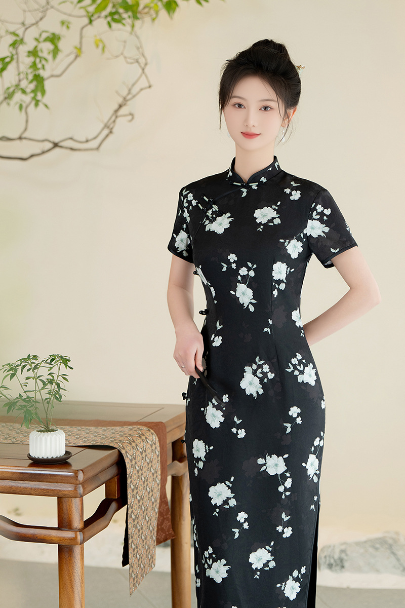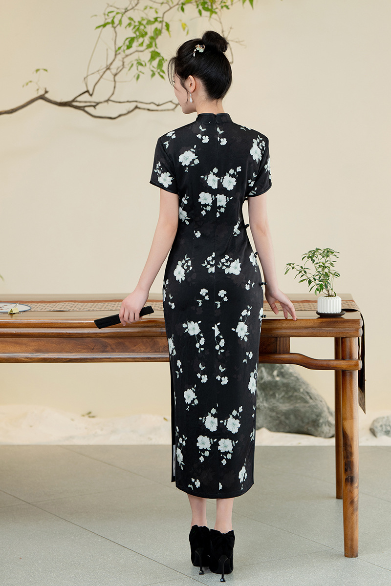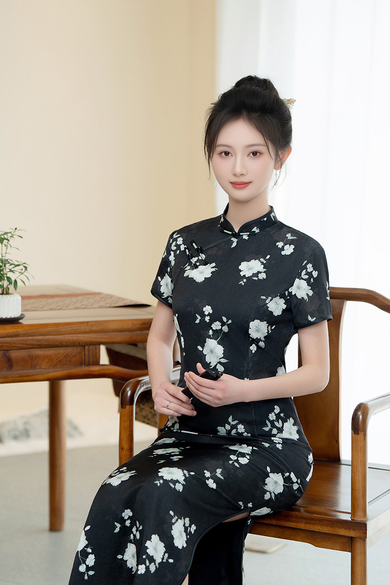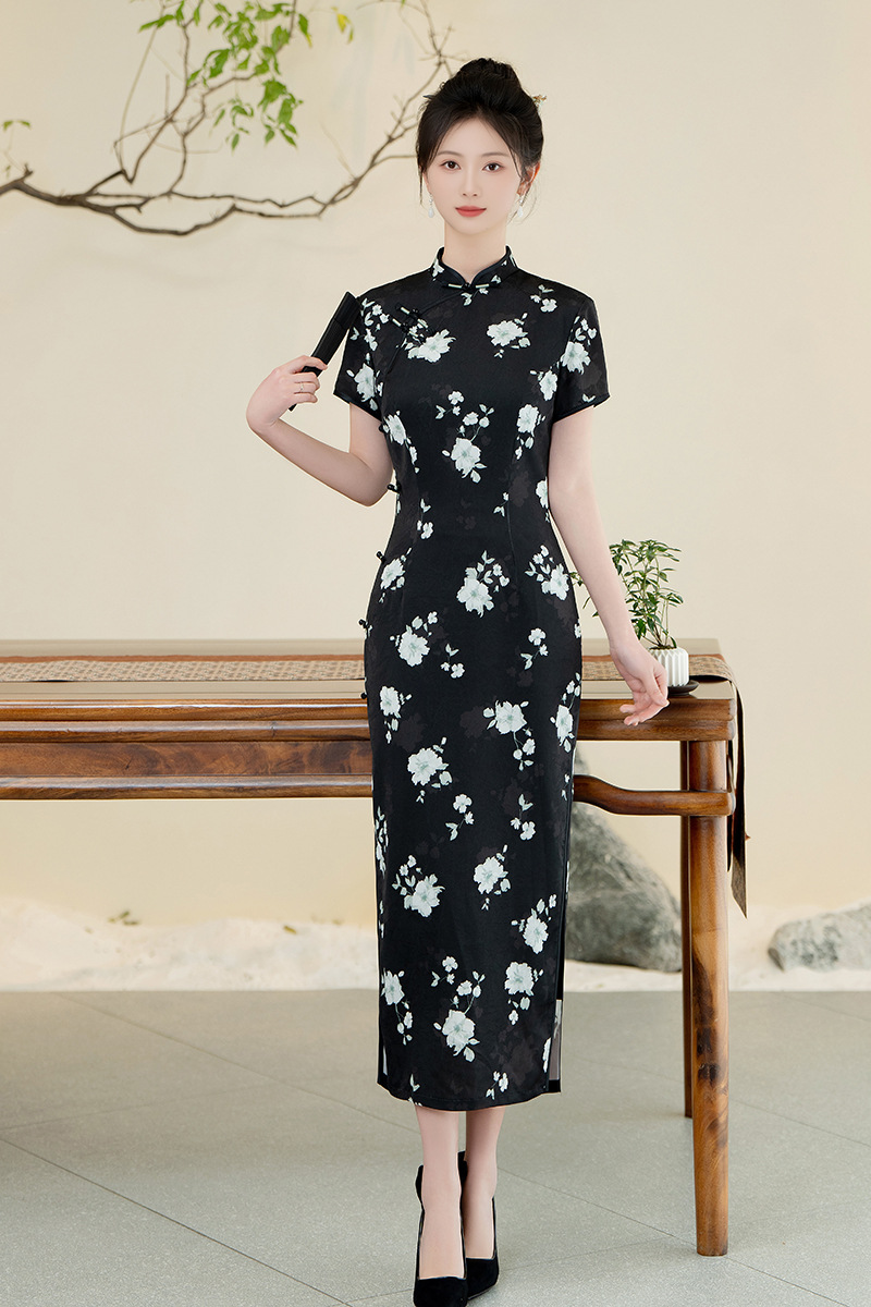 TZW-珍爱一生2025夏季长款提花双层黑色短袖旗袍日常修身气质改良旗袍