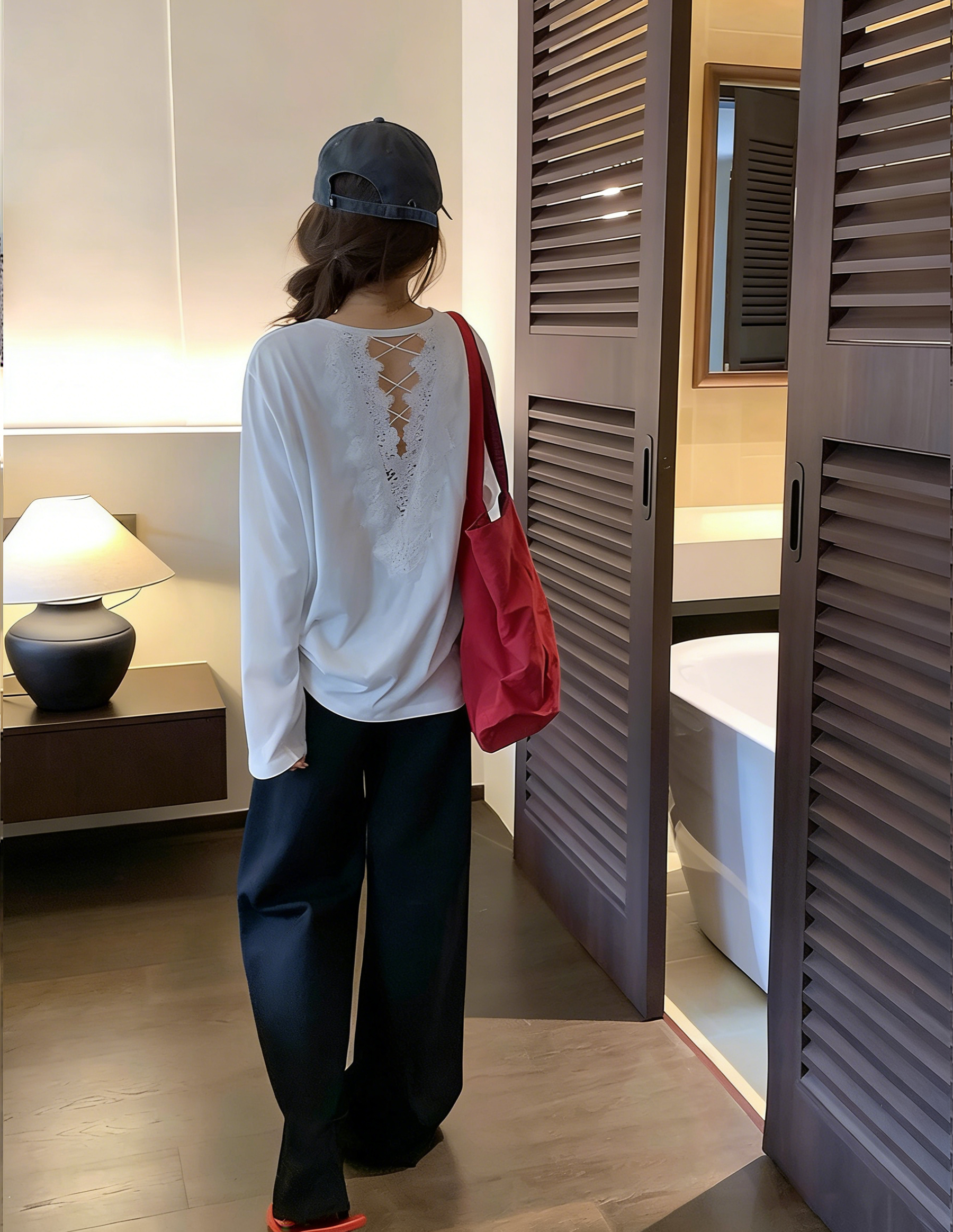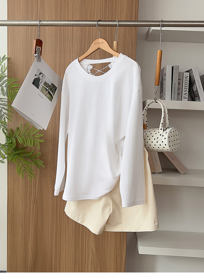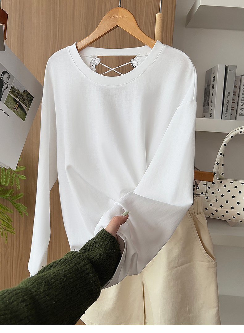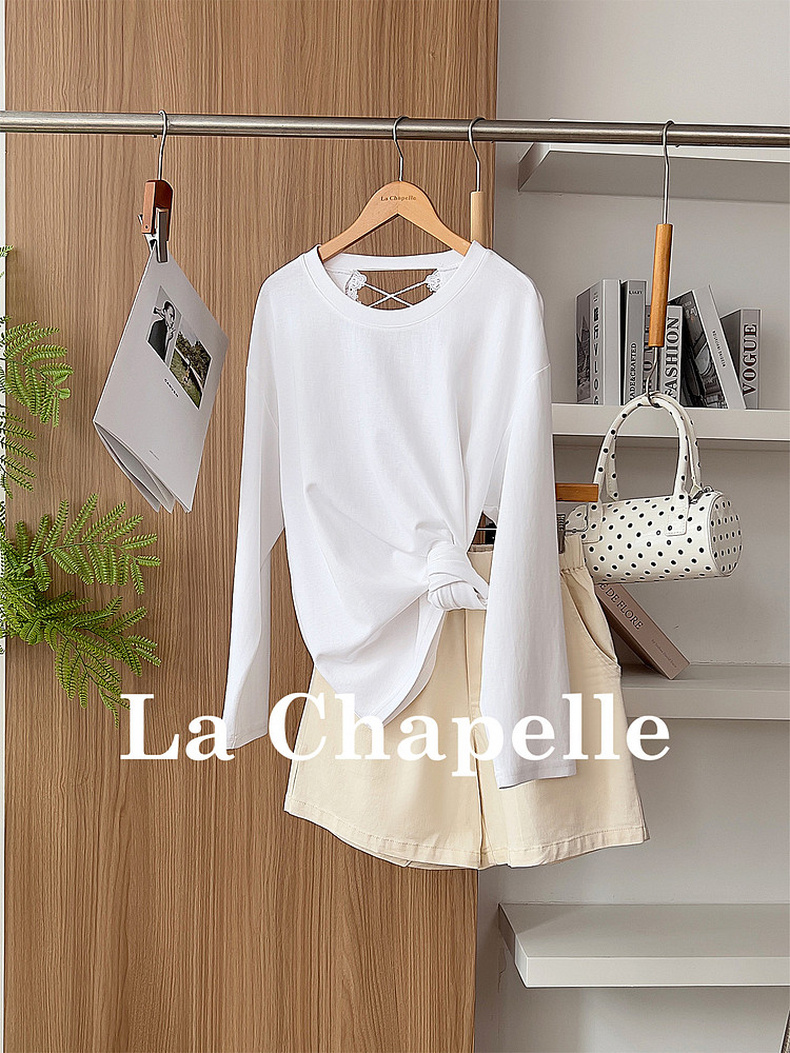 专柜实拍【后背镂空蕾丝】拉夏贝尔/La Chapelle独特款!棉感透气舒适圆领后背镂空蕾丝设计纯色慵懒感长袖T恤衫