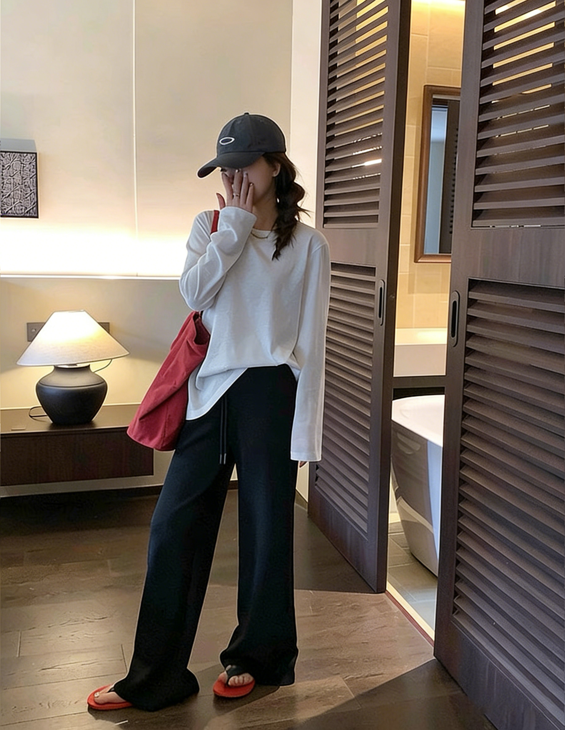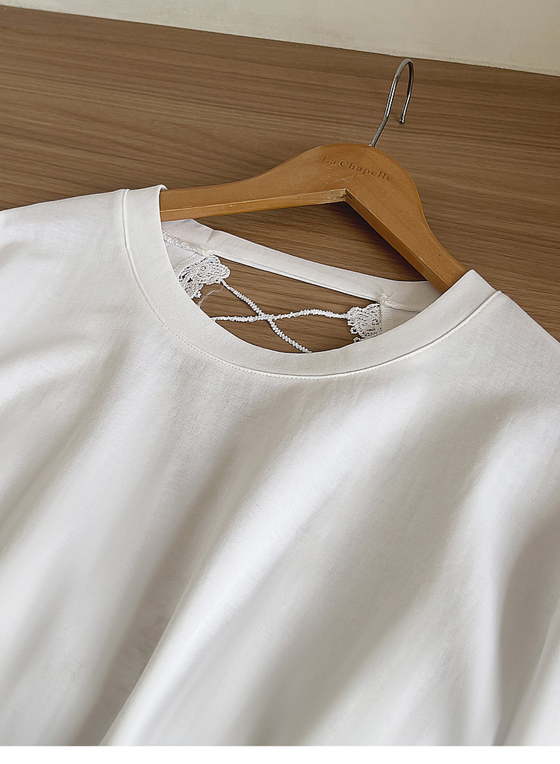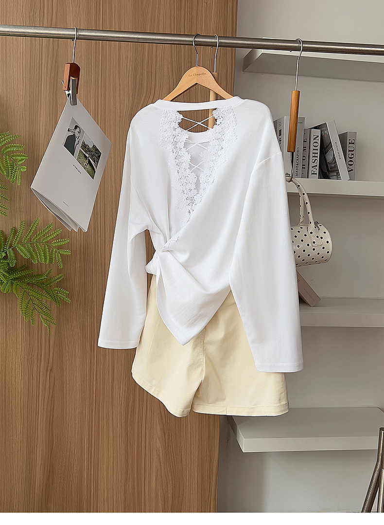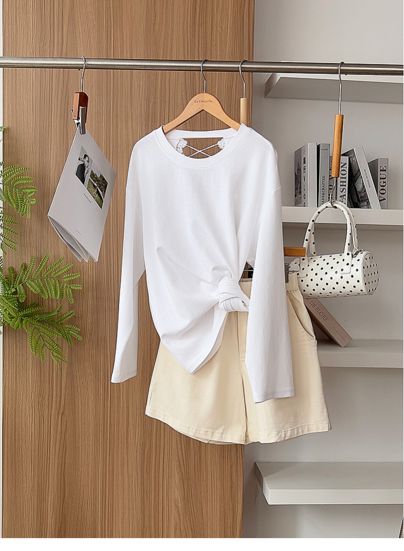 专柜实拍【后背镂空蕾丝】拉夏贝尔/La Chapelle独特款!棉感透气舒适圆领后背镂空蕾丝设计纯色慵懒感长袖T恤衫
