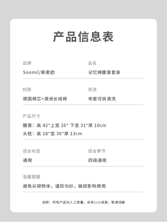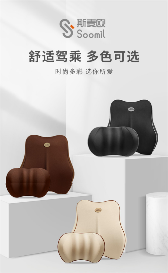 通过大量的人体脊椎数据分析再结合德国一体成型的工艺,设计并生产了这款记忆棉腰靠套装, 高度环抱贴合,实现人体曲线与腰靠弧度精准匹配,高效保护脊椎,舒适加持。 内凹枕面,根据颈部曲线而设计,与头肩颈三个点高度贴合,绵软柔弹,开车也可以很舒适。