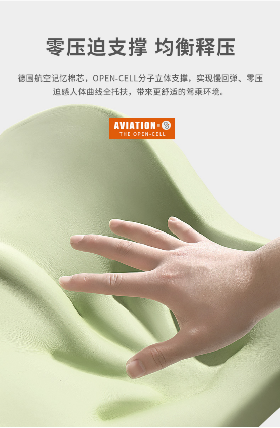 德国航空记忆棉芯,立体支撑,软硬适中,实现慢回弹,柔柔的托起整个腰背部,分担人体对脊椎的压力,给你一种舒适的驾车体验感。