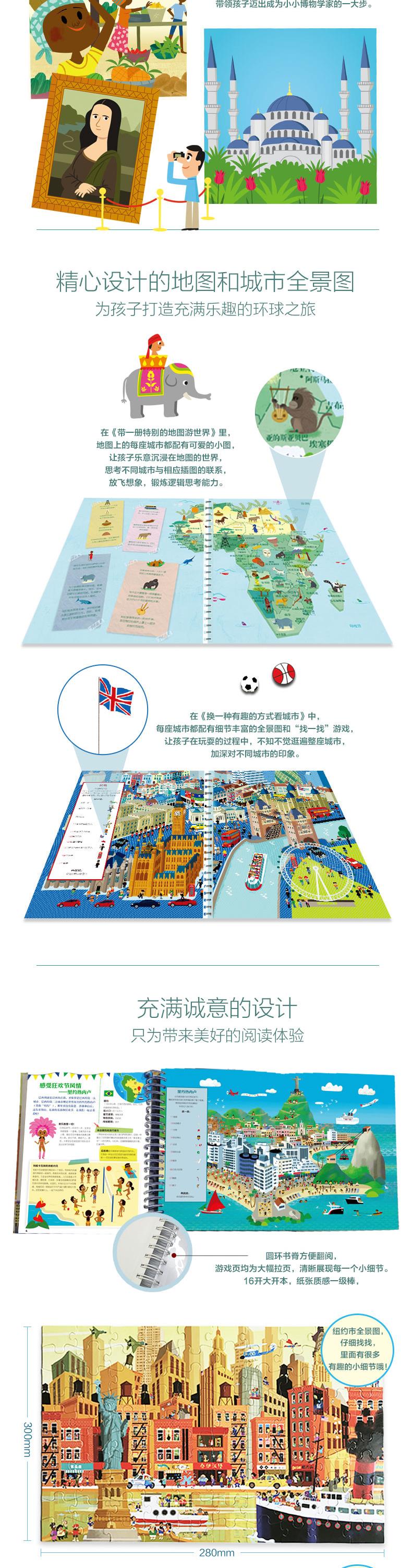 《换一种有趣的方式看城市》世界很大,我们的脚步却很小,难以将它一一走遍。不过,这并不妨碍我们拥有环游世界的梦想。在梦想实现之前,不如先翻开这本书,来一场足不出户的环球之旅吧!这不仅是一本旅行指南、地理人文知识百科全书,也是一本好玩儿的游戏书。里面不仅有萌翻天的插画和丰富有趣的百科知识,更有8幅精心绘制的全景图,为你的“旅程”增添无限乐趣与惊喜。热情似火的巴西里约、优雅迷人的法国巴黎、充满异域风情的印度德里……我们从伦敦出发,走遍九个国家的重要城市,品尝特色美食、欣赏美丽风景、领略不一样的风土人情。超豪华的游览线路,让你一次看过瘾!本书的主题是“城市”,每介绍完一座城市,都配有相应的趣味全景图,把每座城市最有特色的人文景观囊括其中。另外,全景图还配有相应的寻图游戏,在游戏的过程中,读者不知不觉就能走遍城市的大街小巷,最有风情的景色会深深印在脑中。同样,这本书清新可爱的插画也能牢牢吸引住读者的......