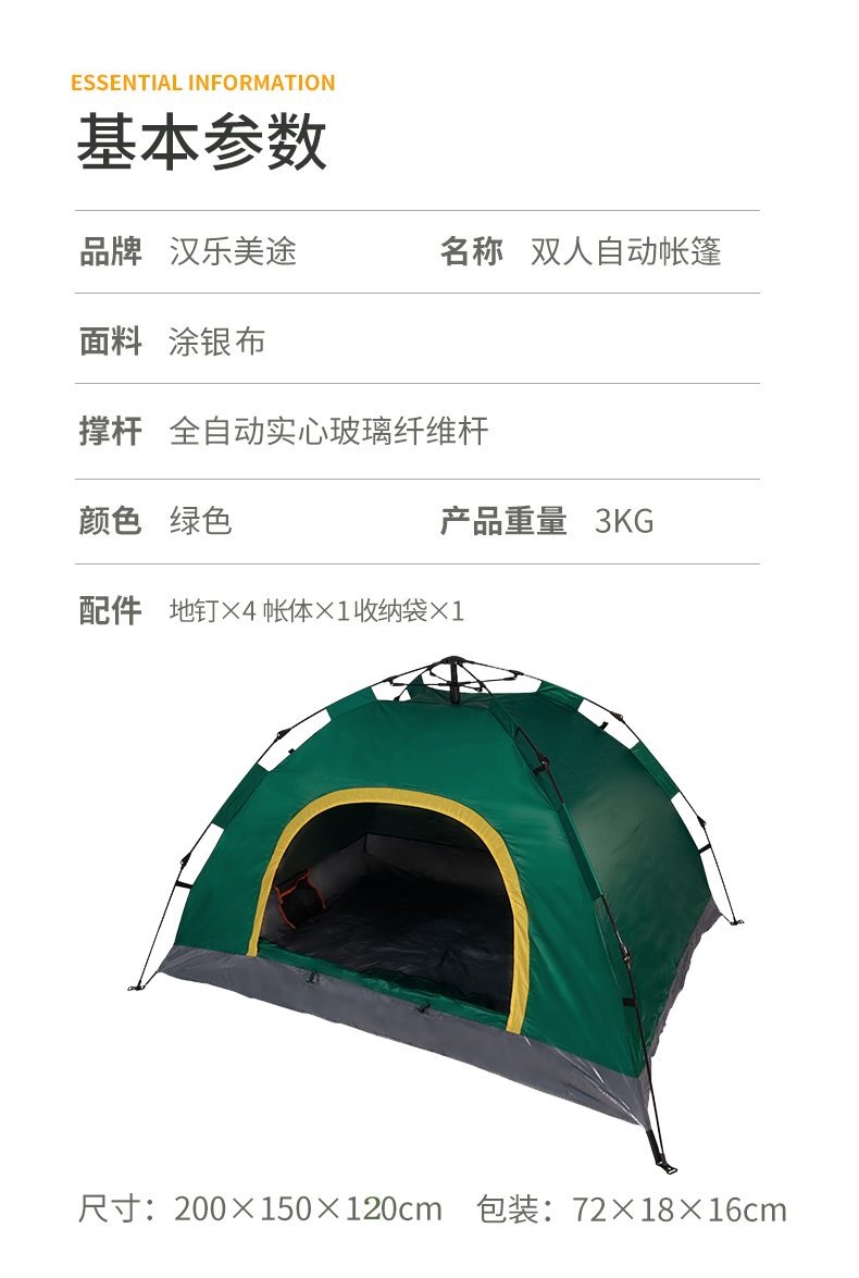 自营(北京董礼)-汉乐美途双人自动帐篷HL-0110 2*1.5M 绿色