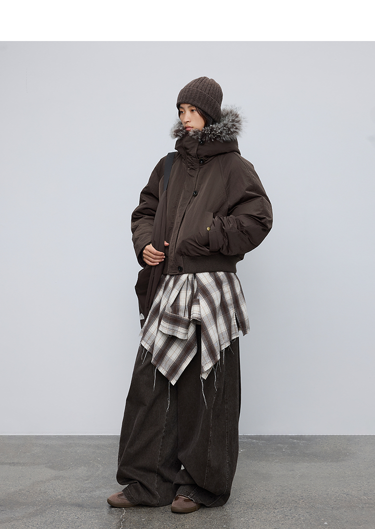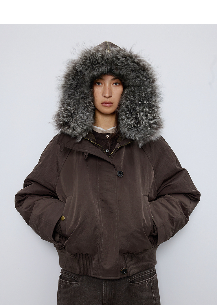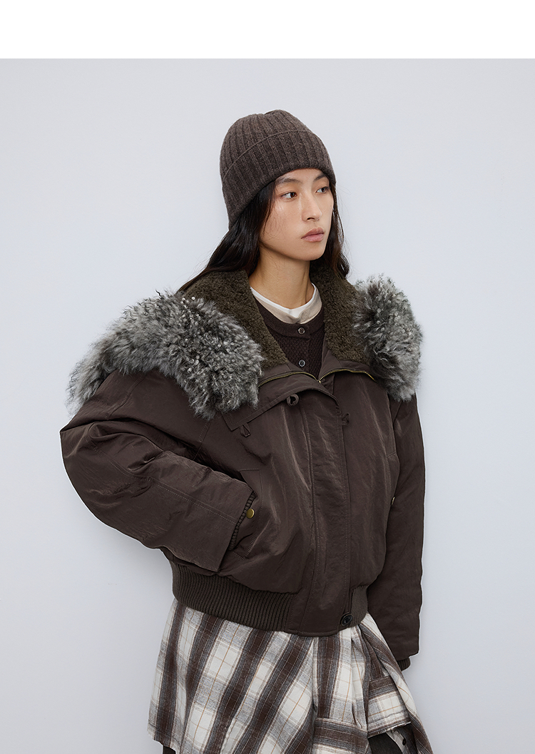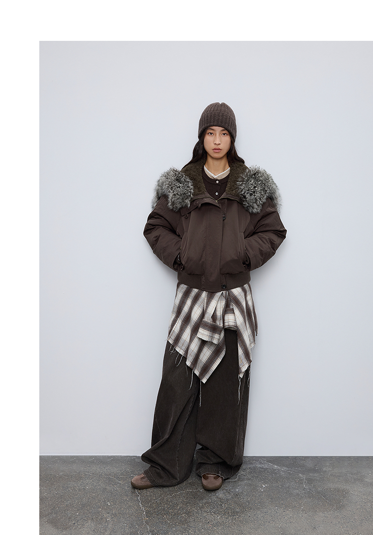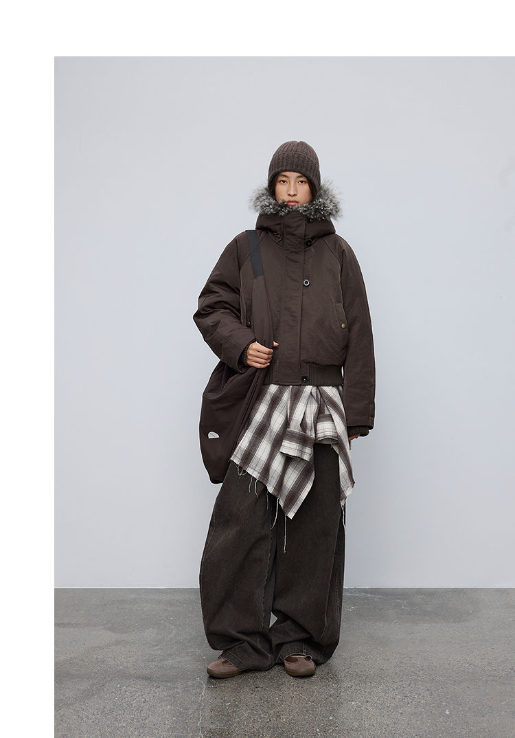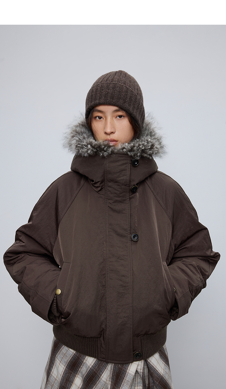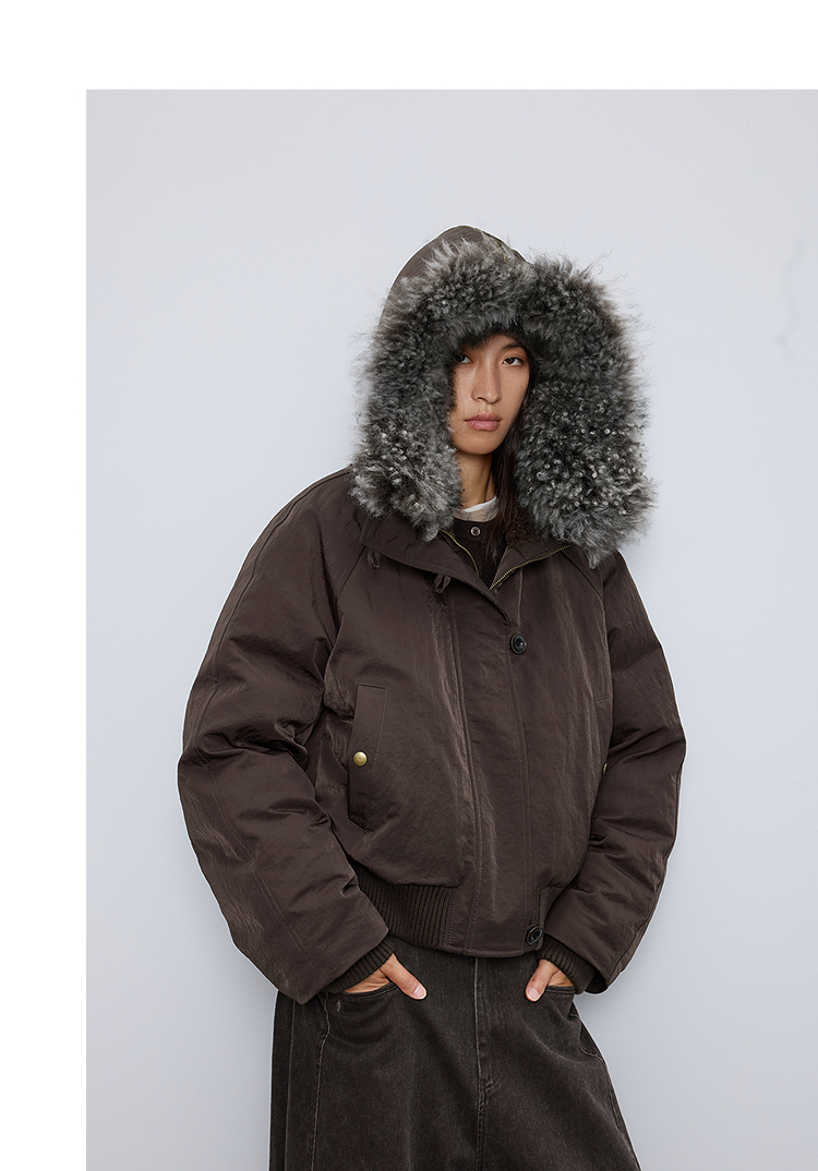 半圆/D51111126/拼接羊毛领宽松短款羽绒服
