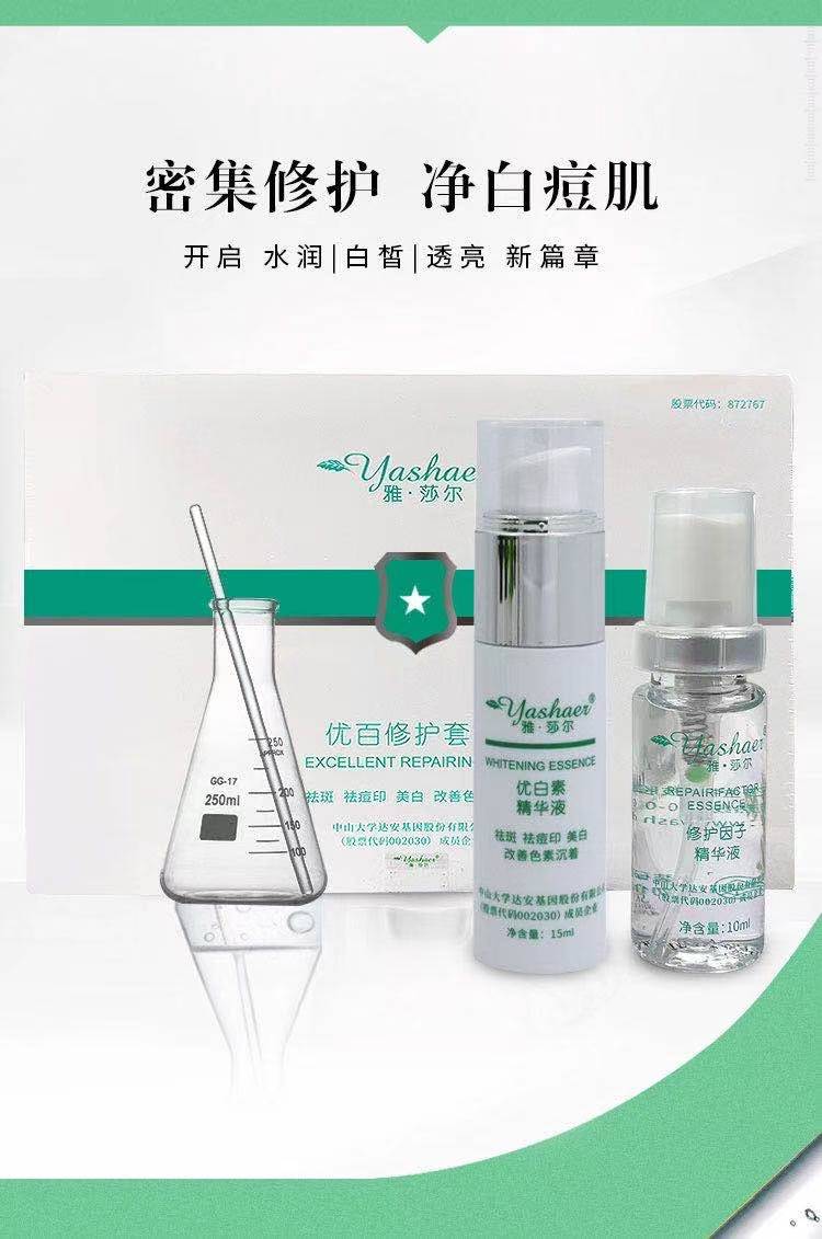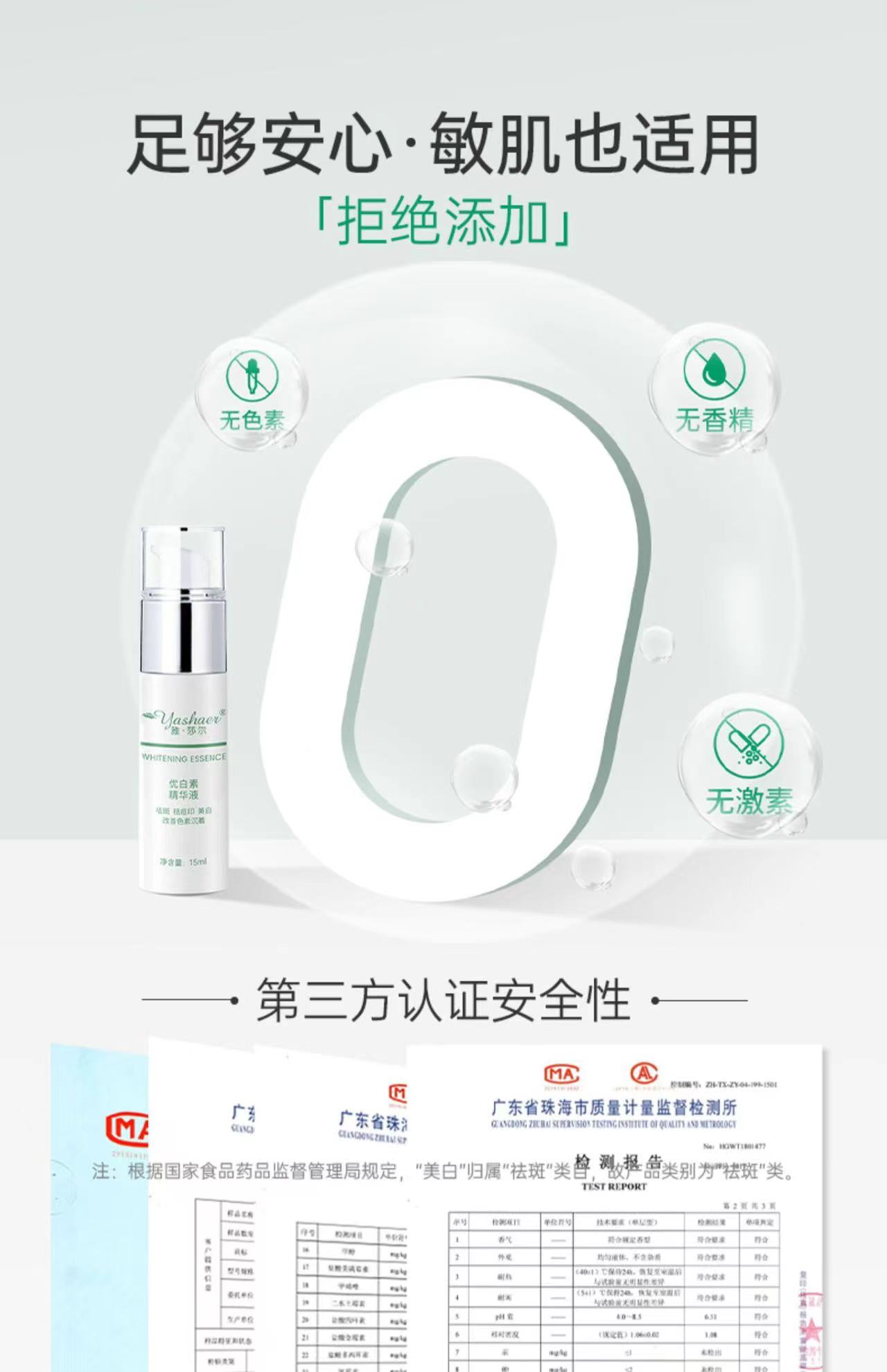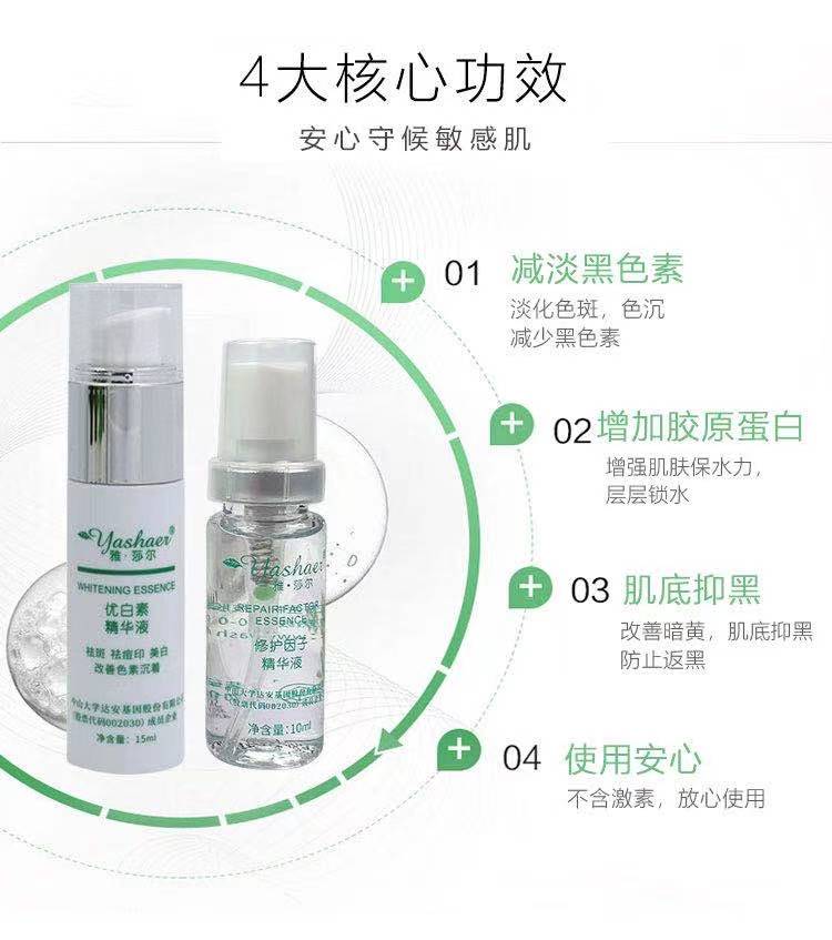 第3步 将优白素精华液抹于喷过修护因子精华液的修护部位。另取本品1~2 滴,加按摩至吸收。每日使用一次。