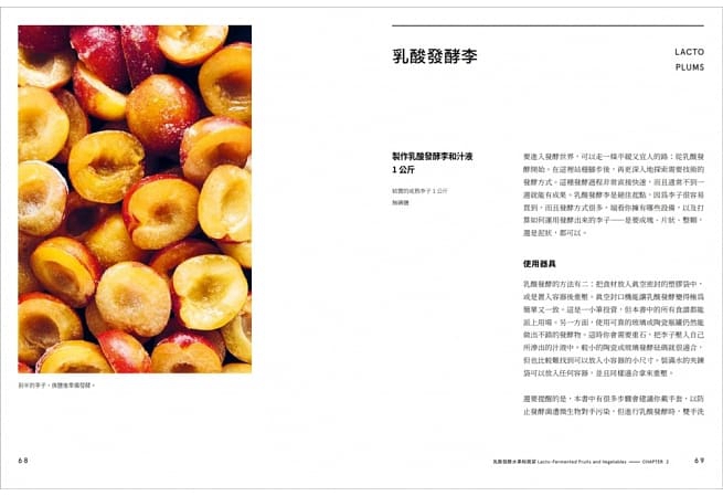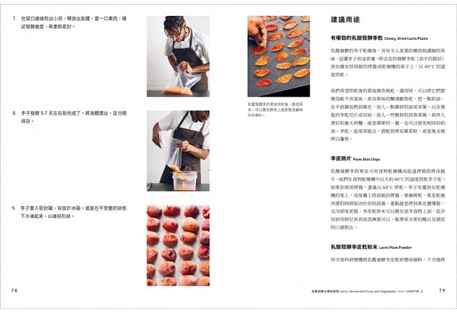 「有些發酵物就像是味精、檸檬汁、糖和鹽完美合而為一的調味聖品,可以灑在煮好的青菜上,可以加到湯中,或是拌入醬汁裡。也可以把乳酸發酵過的李子抹在煮好的肉上,或把發酵出來的李子汁淋上生海鮮。裝在玻璃罐中的自製發酵品也可變身成獨特而動人的禮物。把這些食材納入烹飪之中,你的飮食生活將邁入更加美好的境界。」