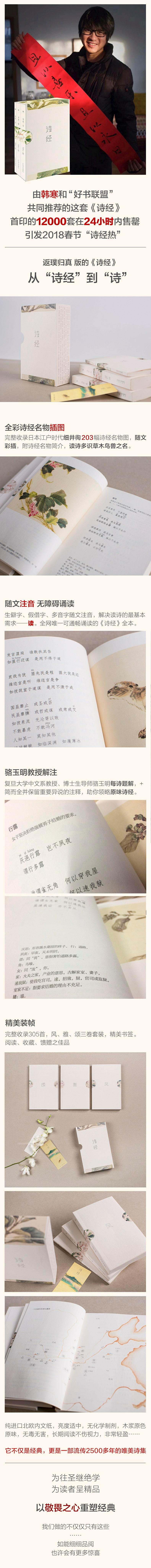 《诗经》(全三册)全注释,全彩插图,无障碍朗读版. 两千多年来,这些富于生活气息的诗句,向我们说着日常的欢喜和忧伤。 本版《诗经》回归“诗”之本质,一部可诵、可赏、易解的唯美古诗集。 《风》《雅》《颂》三卷册套装 以《毛诗正义》为底本,收录全篇305首。 复旦大学中文系教授骆玉明解注。每诗题解+简而全的注释,助你领略诗之原义。 收录日本江户时代细井徇全203幅《诗经名物图》,随文彩插,附名物简介,实现读诗“多识鸟兽草木之名”的孔子名言。 注音版无障碍阅读,文中多处生僻字、多音字、假借字随文注音。古人云“无诗不言”,本版助你通畅诵读整部《诗经》。