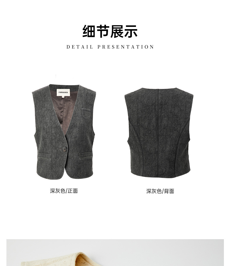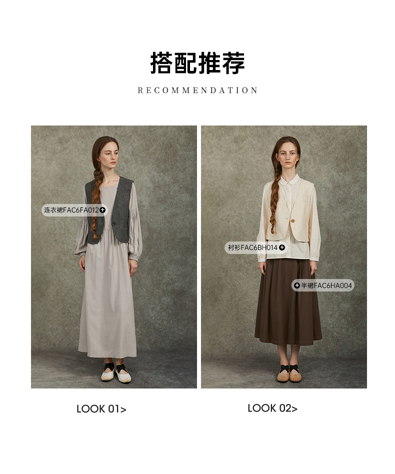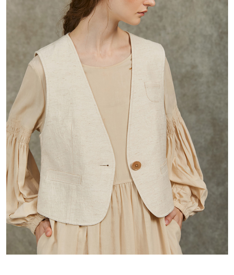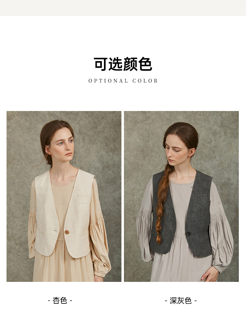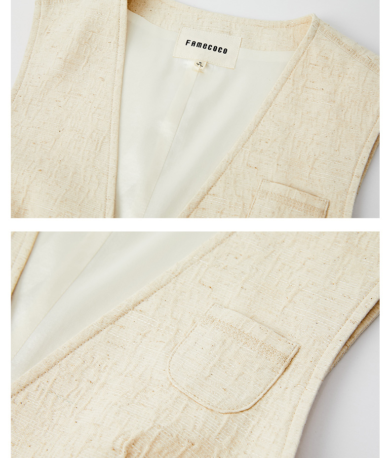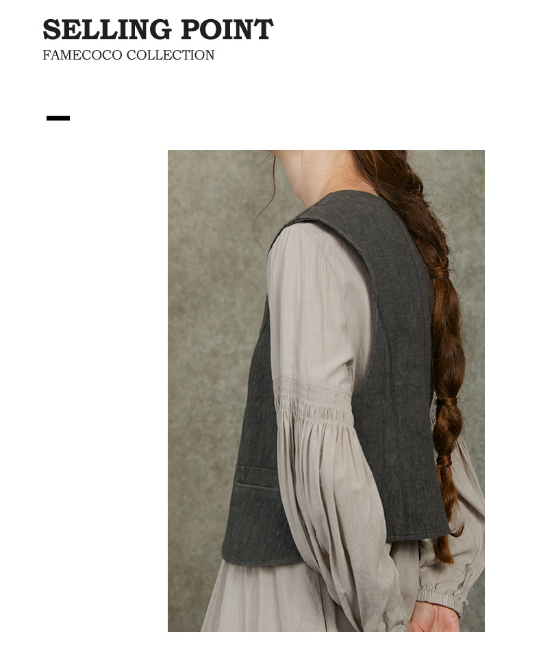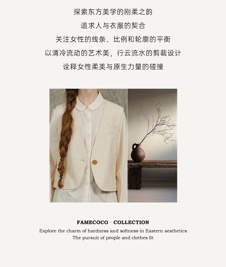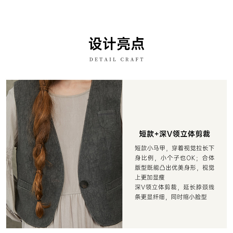 Famecoco文艺范儿深V领设计立体裁剪棉麻百搭马甲春FAC6CA012
