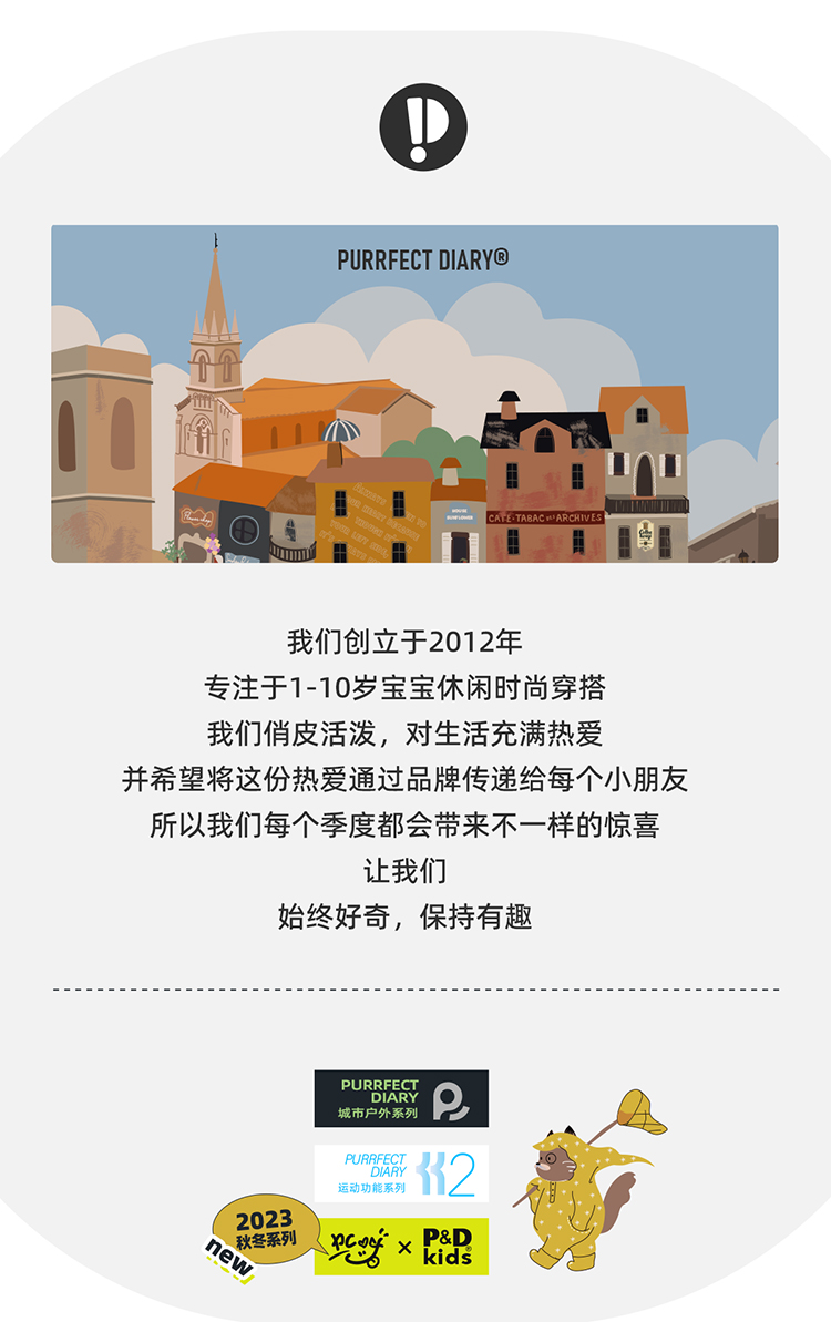- Purrfect-Diary专注于贴近自然随性的穿着概念,轻奢平价的童装文化传播,在产品设计上更加注重婴童穿着的舒适性、安全性、更出众的国际化品牌,将欧美的育婴文化在中国进行深入的传播与推广。