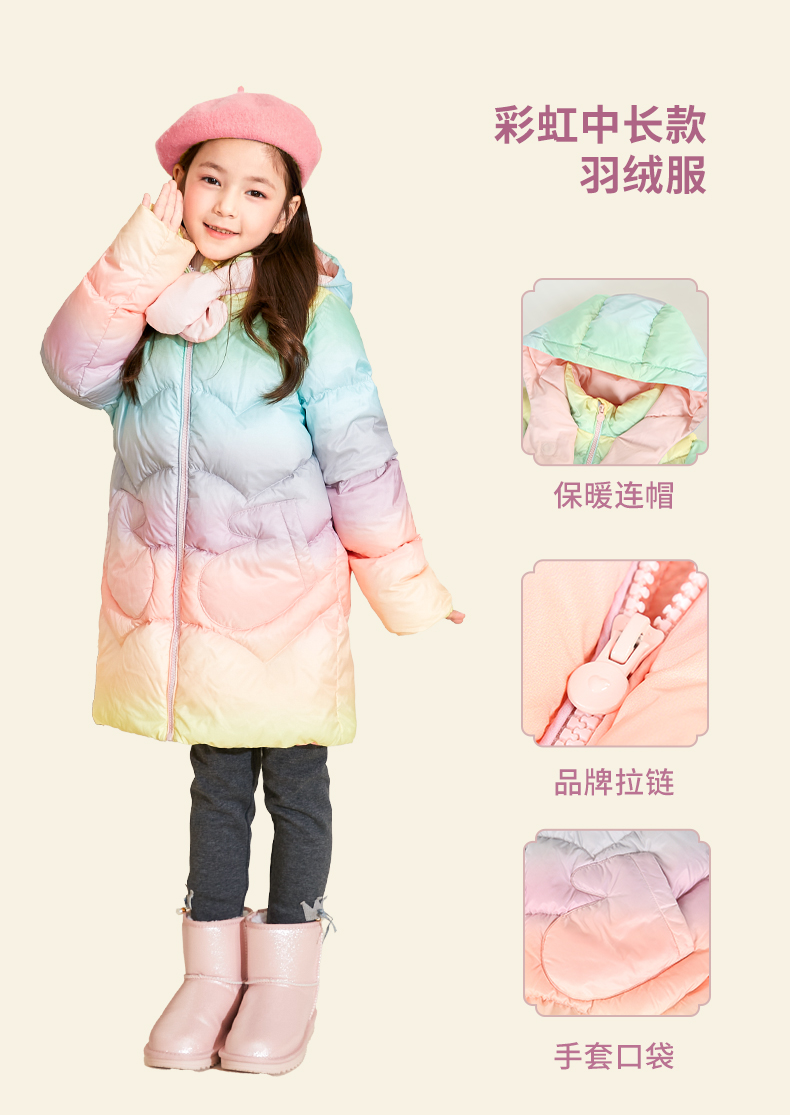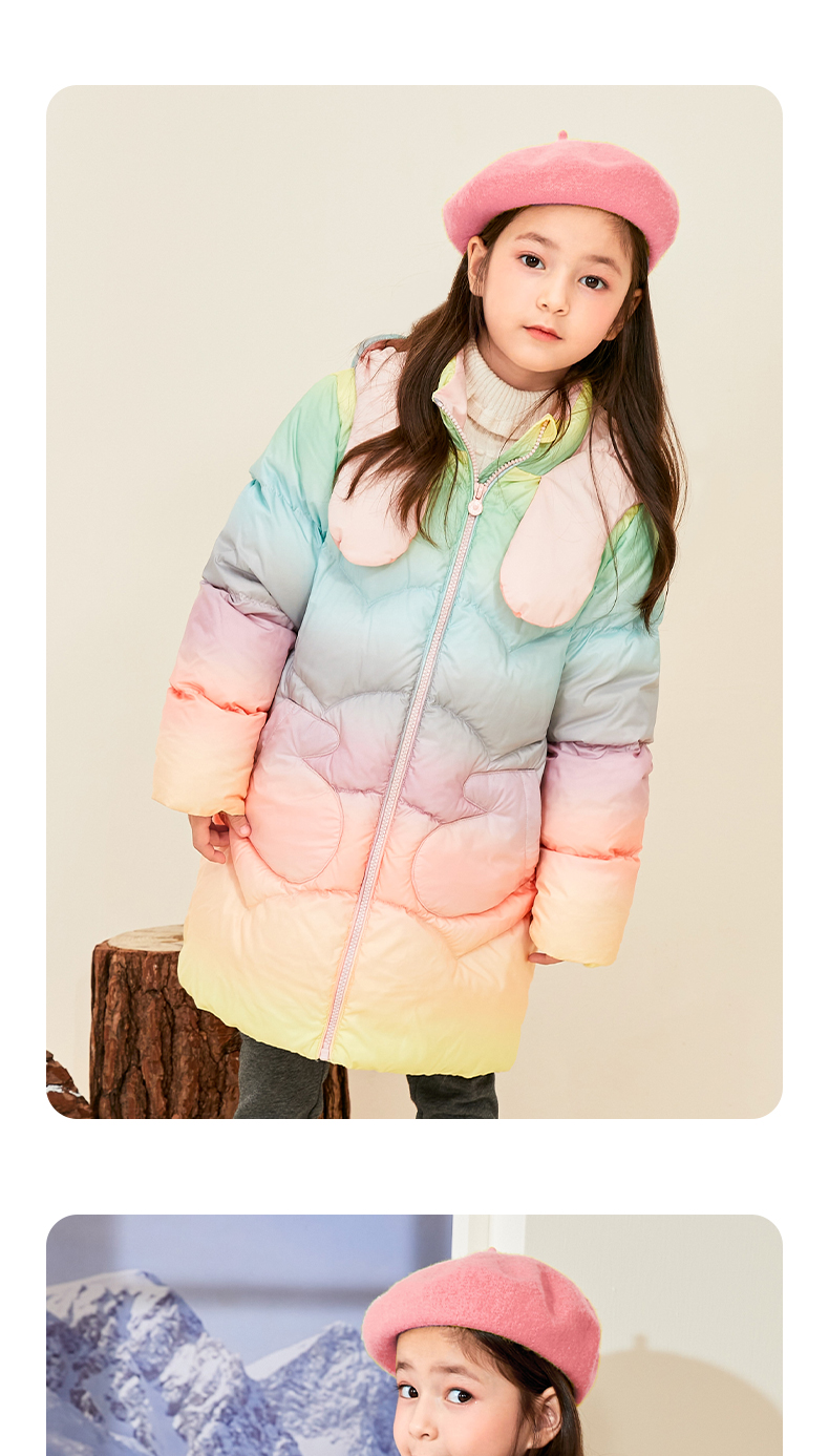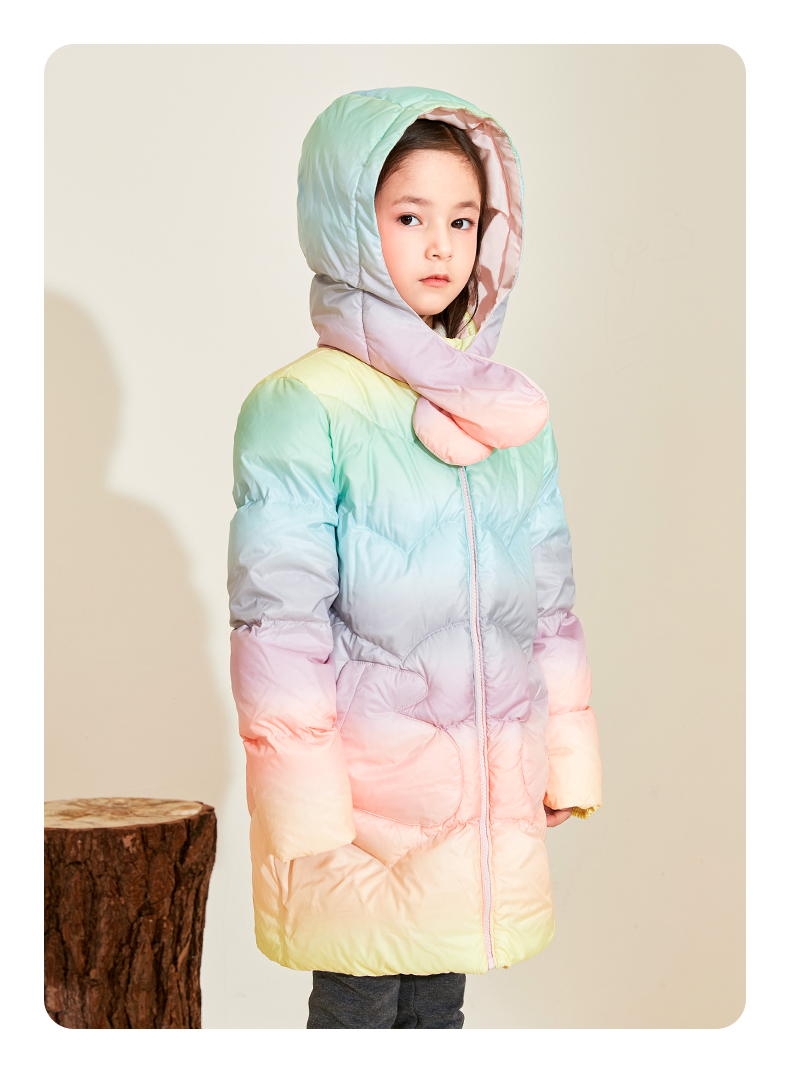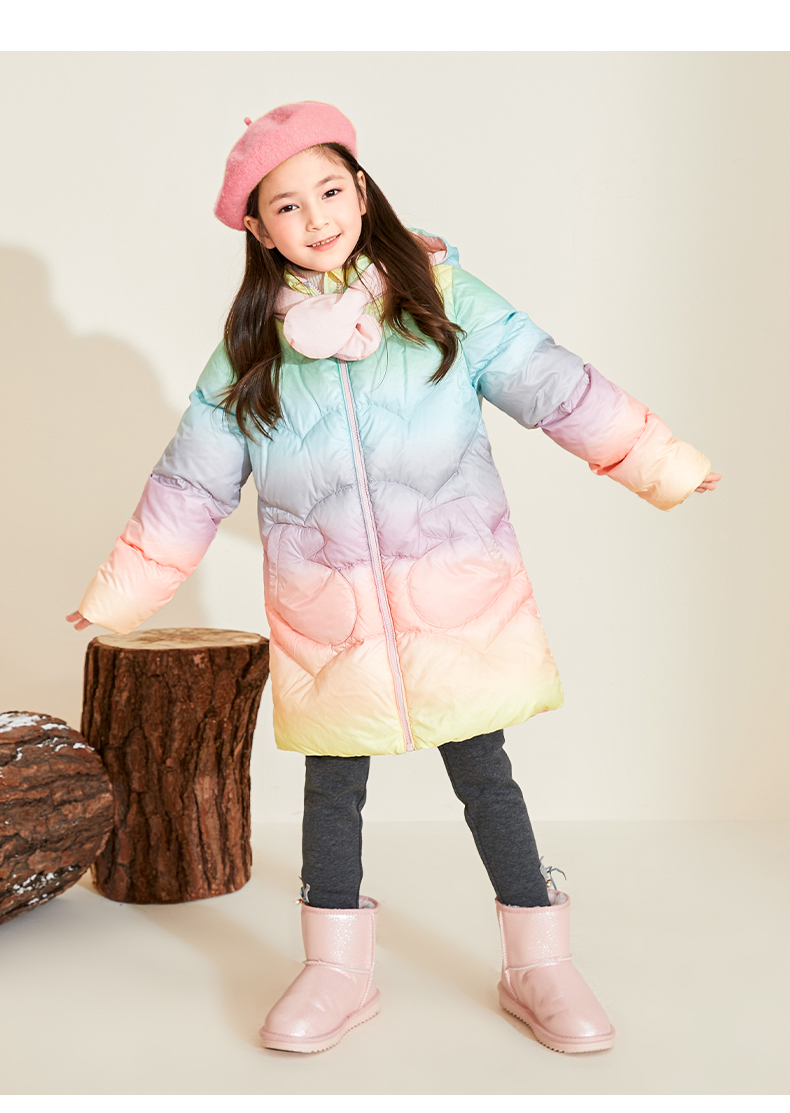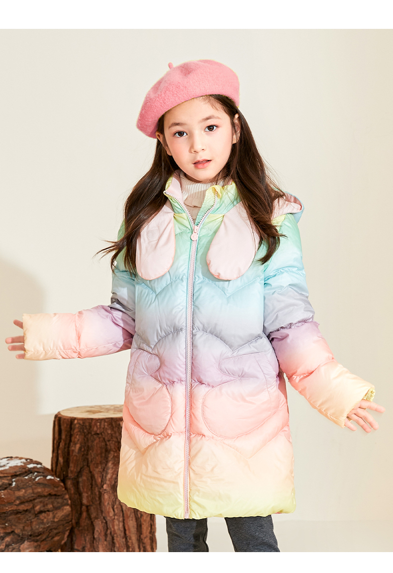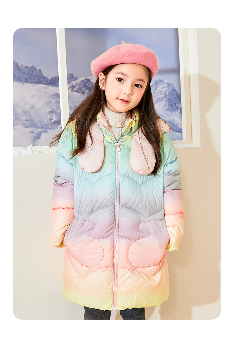 mettekids女童羽绒服冬季彩虹色白鹅绒儿童中长款加厚中大童外套