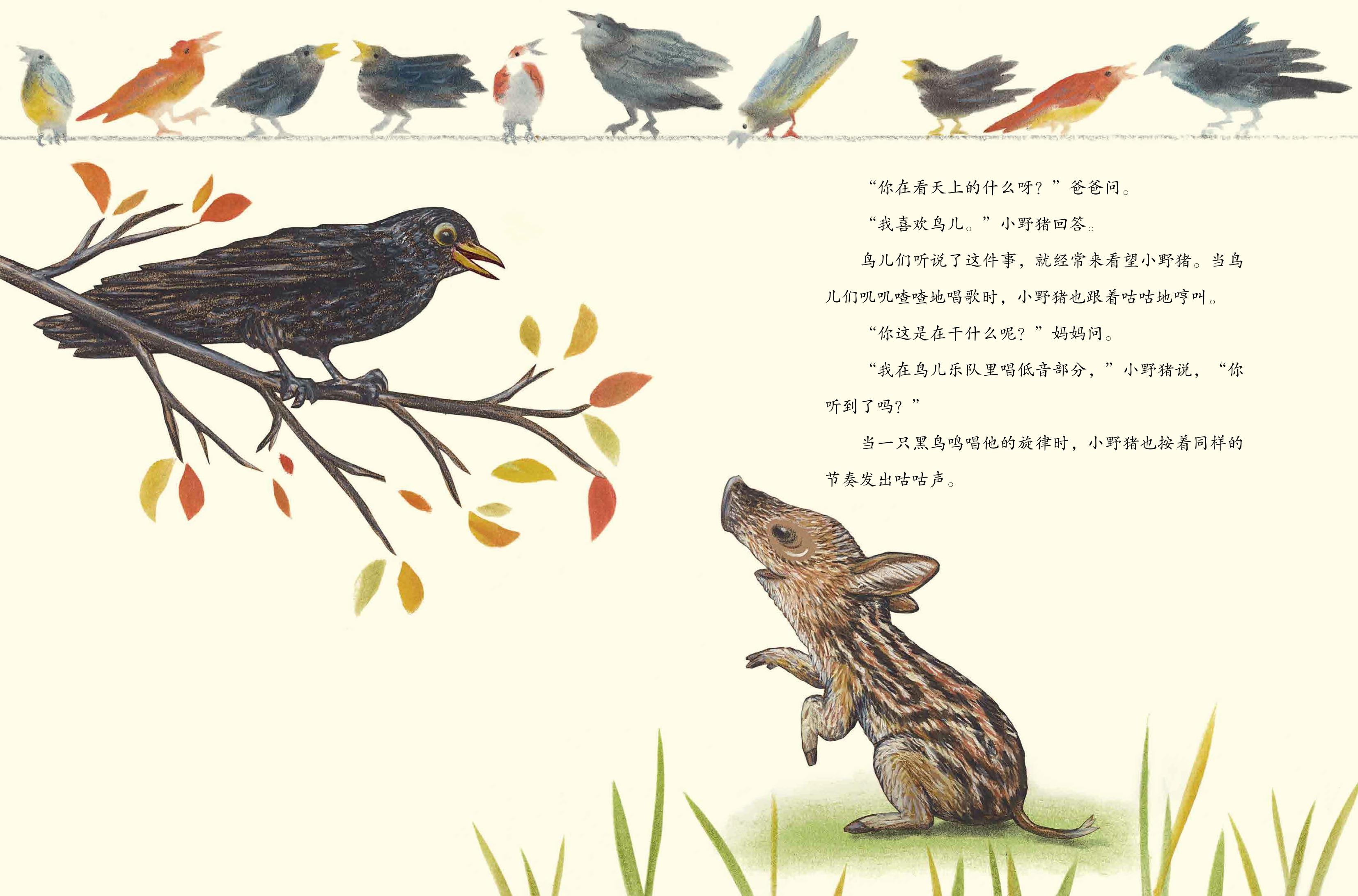 这只小野猪和他的五个哥哥姐姐不一样,他喜欢特立独行。当其他野猪在用嘴巴拱地时,他却喜欢抬头仰望天空,倾听鸟儿的歌声。不久,他便和鸟儿们一起合唱了鸟儿奏鸣曲。父母对此只能无奈摇头。小野猪甚至会和他的鸟儿伙伴们分享玉米棒!直到有一天,小野猪生病了,似乎什么都帮不了他—只有那些会飞的朋友……!
