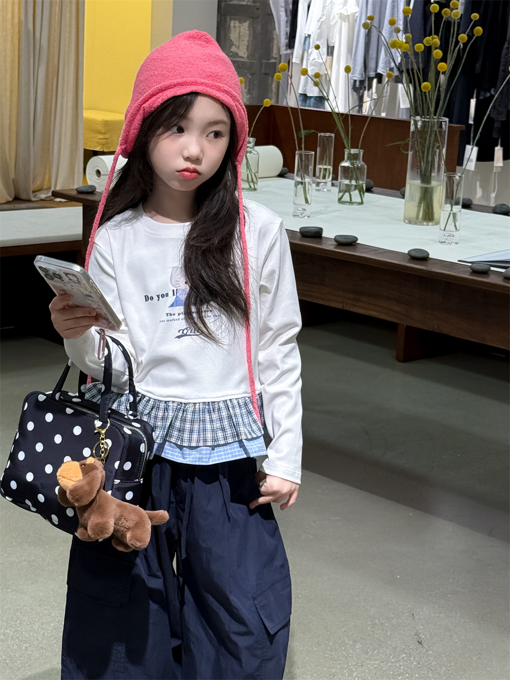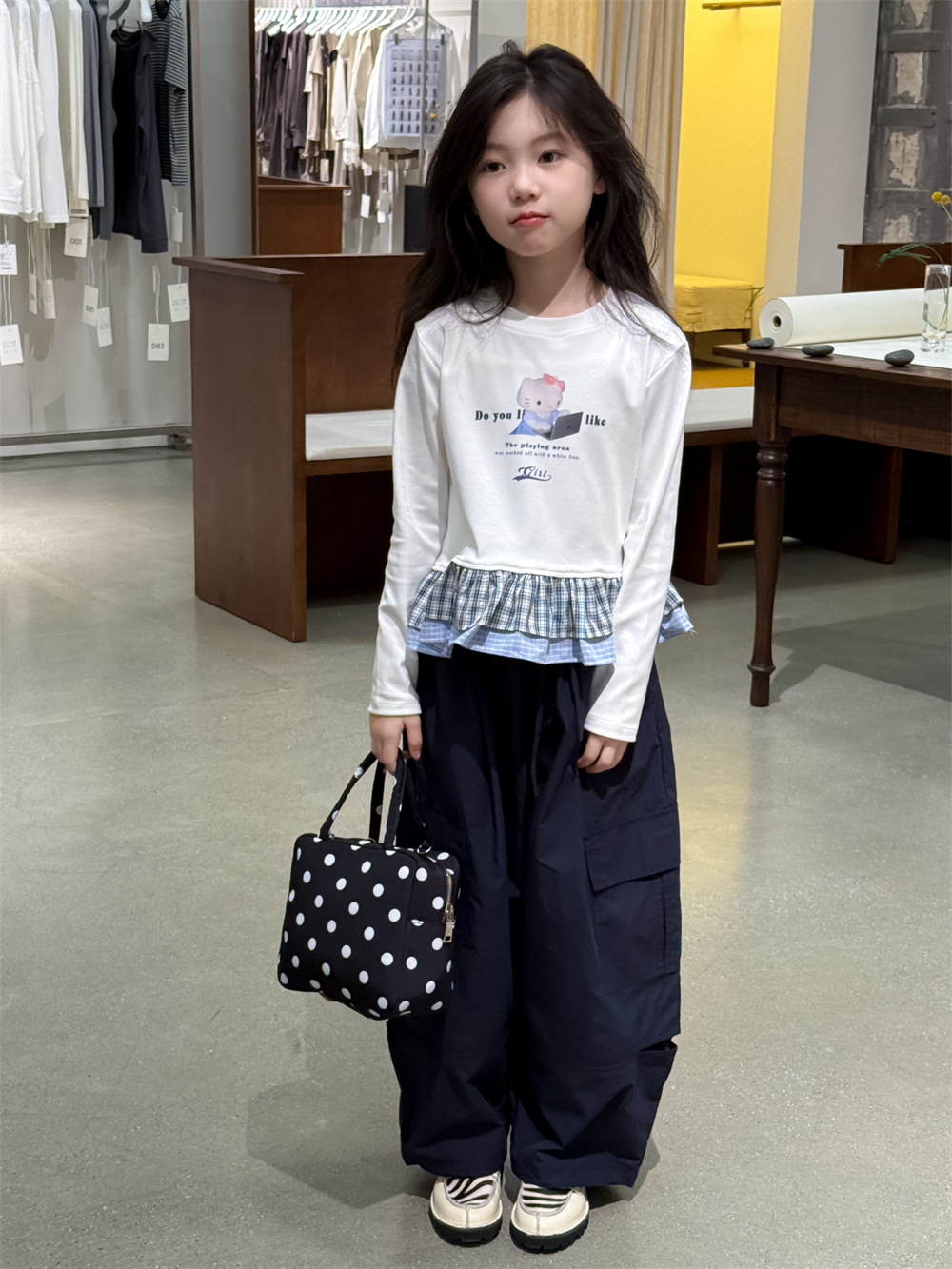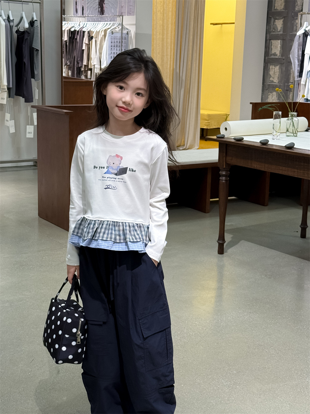 宸之昊CZH2025秋季新款童装女童卡通T恤中小童格子花边拼接上衣长袖打底衫★