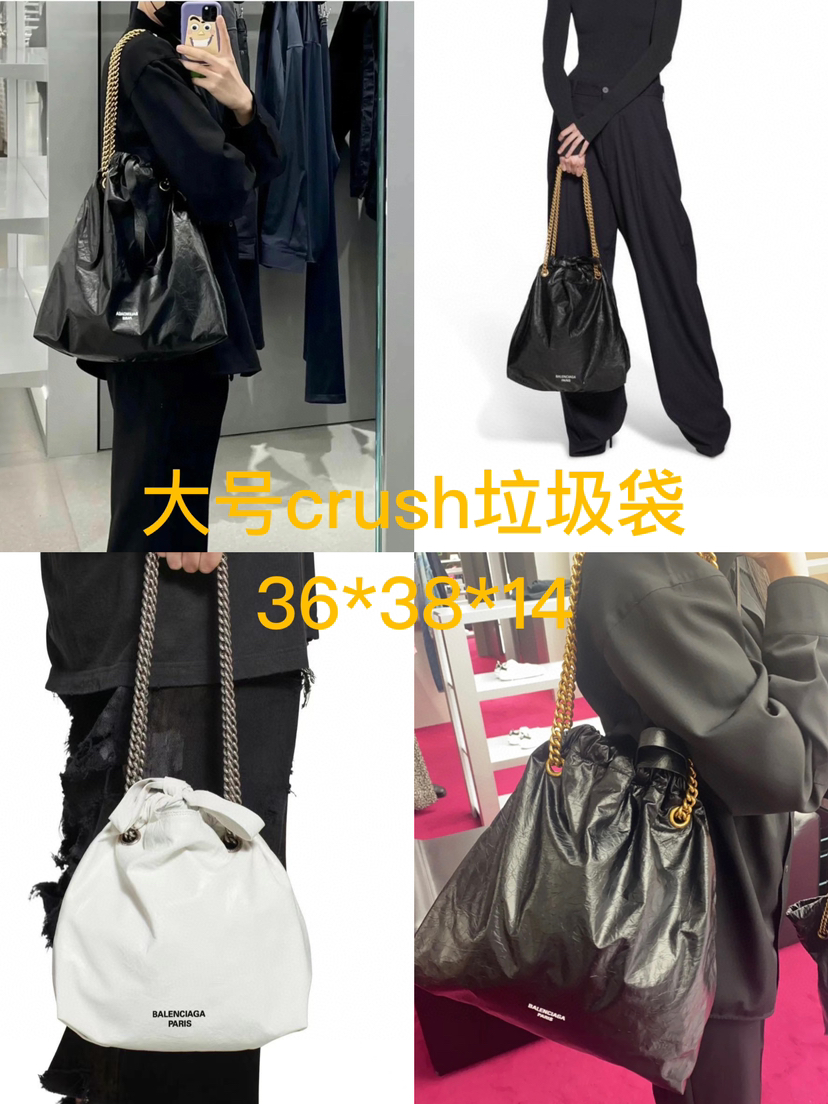 实拍来,新款crush tote垃圾袋,完全气场全开,采用亮面褶皱小牛皮,模拟垃圾袋被蹂躏的质感,咱们是完完全全原版皮质,进口小胎牛,完整还原crush褶皱皮的复古质感。搭配上古铜色复古质感的五金,整体drama时髦拉满。垃圾分类,从我做起。