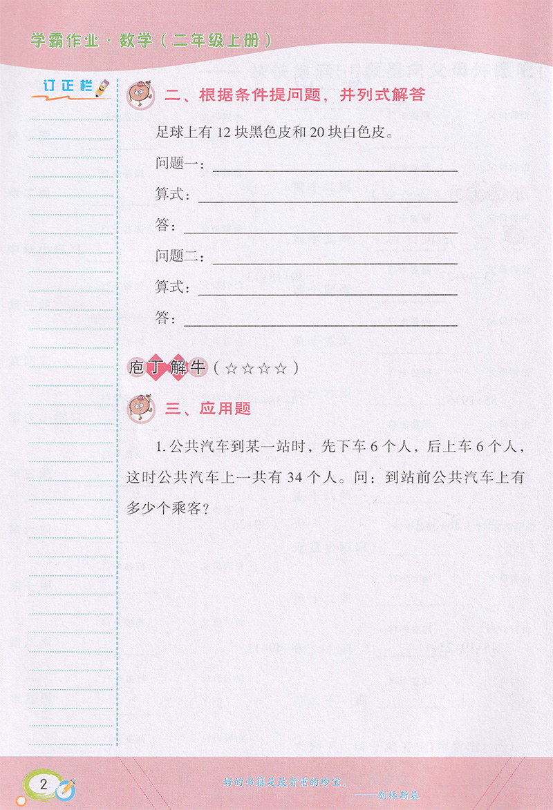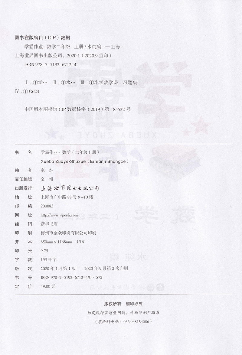 学霸作业 二年级上册/2年级第一学期 数学 含测试卷 与上海版教材配套教辅