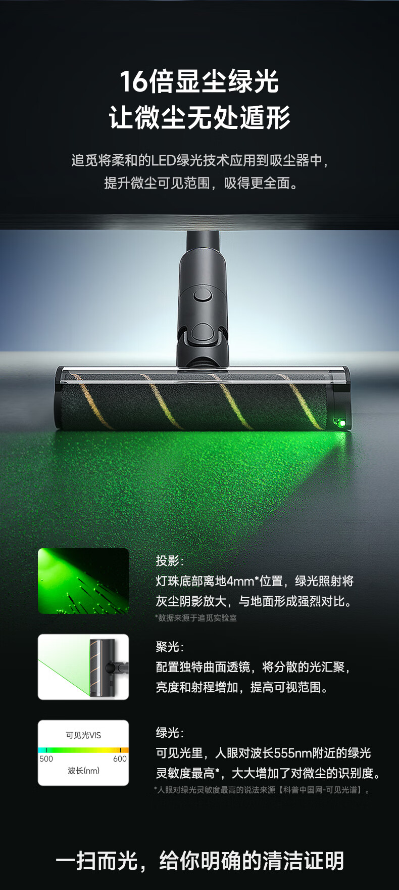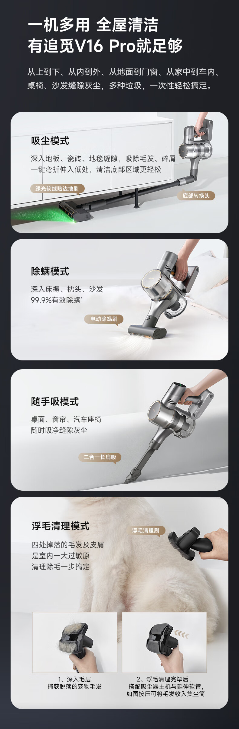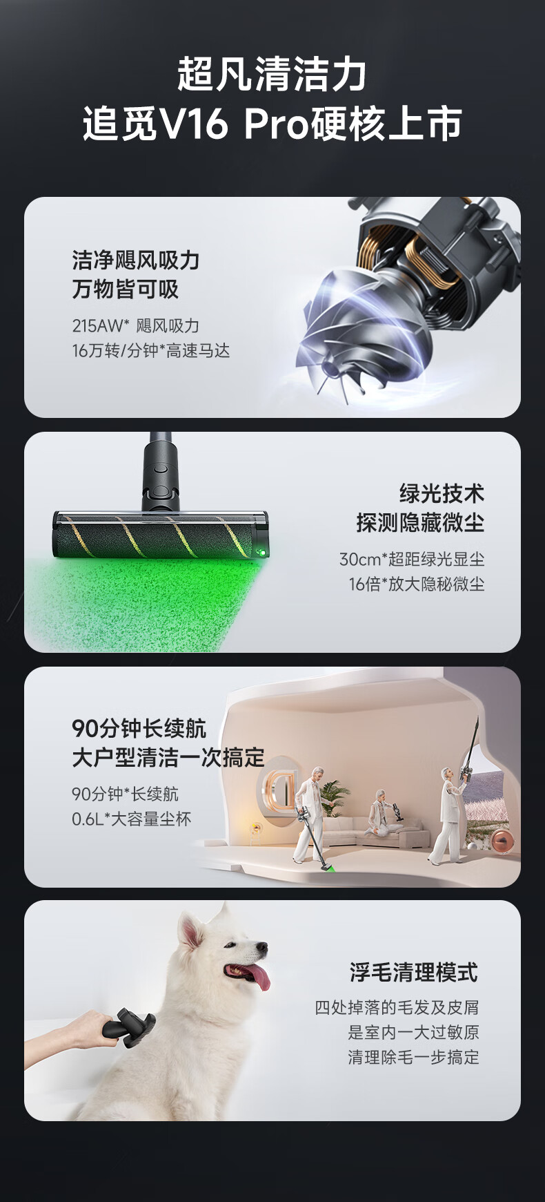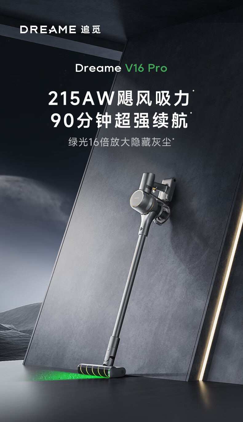 追觅吸尘器V16 Pro 家用无线手持 215AW大吸力 90分钟长续航 新配浮毛刷 可除螨 绿光显尘 宠物适用