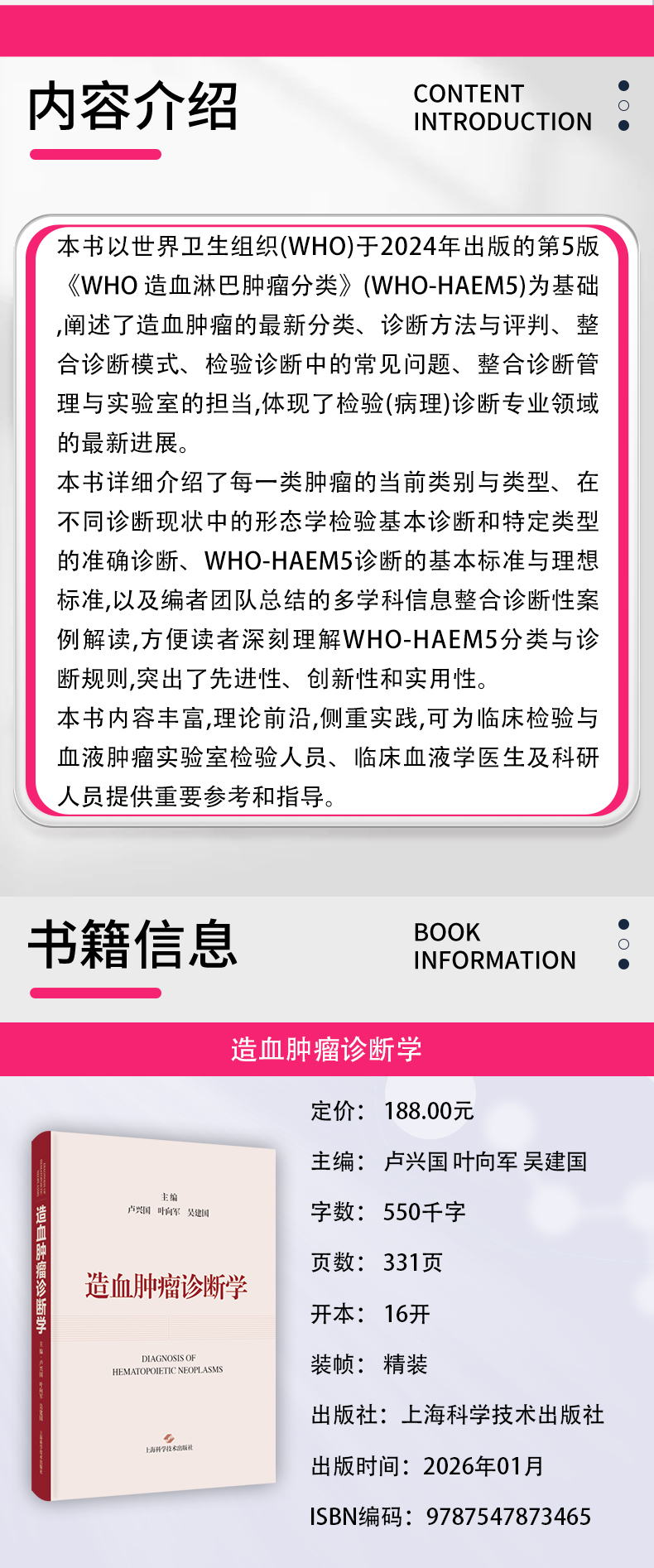 造血肿瘤诊断学 卢兴国 叶向军 吴建国 基于WHO-HAEM5诊断标准 介绍造血肿瘤最新分类 诊断方法与评判断模式等 上海科学技术出版社