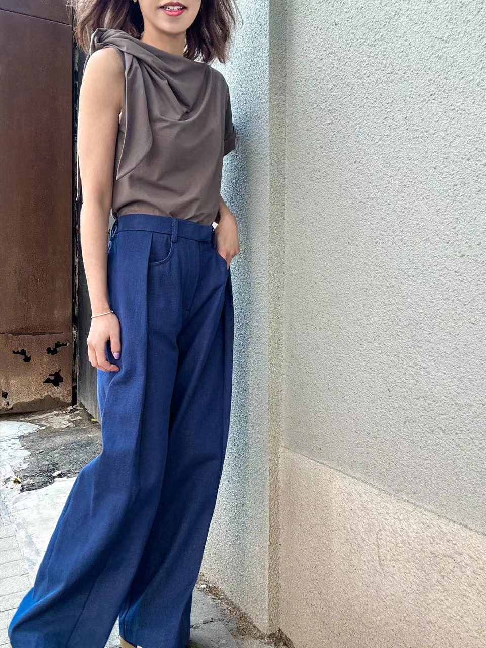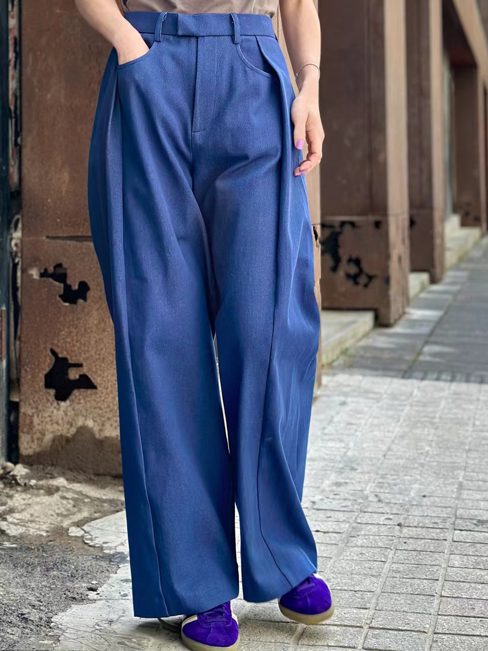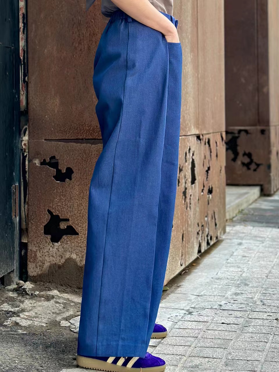 TYNVIE 后松紧腰阔腿裤-牛仔蓝