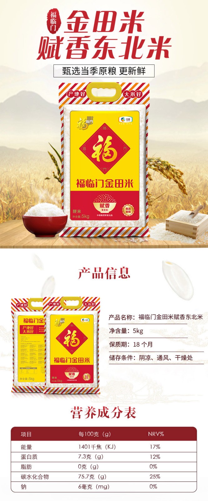 中粮福临门金田米赋香东北米5kg